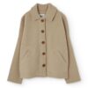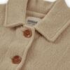 Abrigo corto en tono beige con un corte de inspiración retro, cuello camisero, hombro caído y bolsillos diagonales. Una prenda pensada para acompañar muchos inviernos, con botones de corozo natural biodegradables.