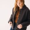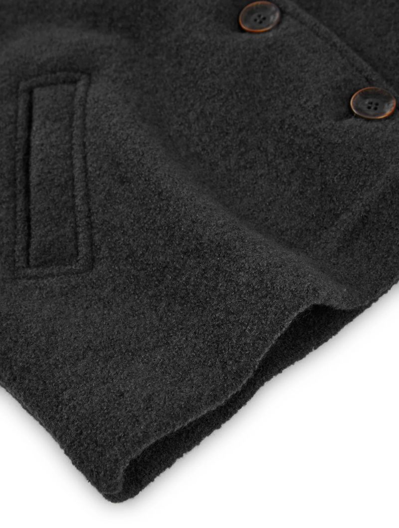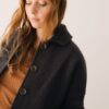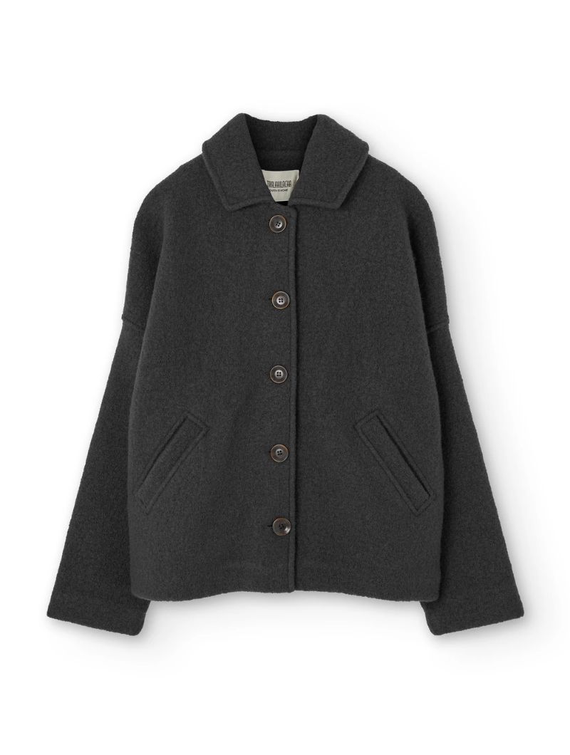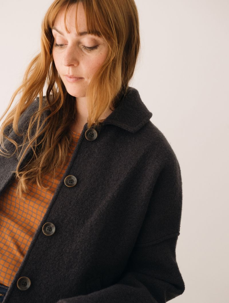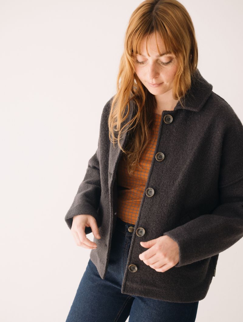 Abrigo corto en gris corteza con corte retro, cuello camisero, hombro caído y bolsillos diagonales. Un diseño que se cierra con botones de corozo natural biodegradables y que incorpora costuras interiores rematadas con bies de algodón en contraste.
