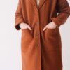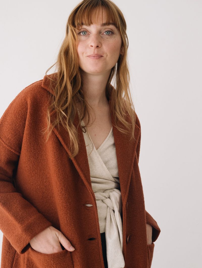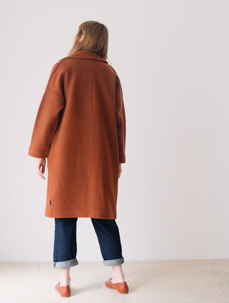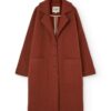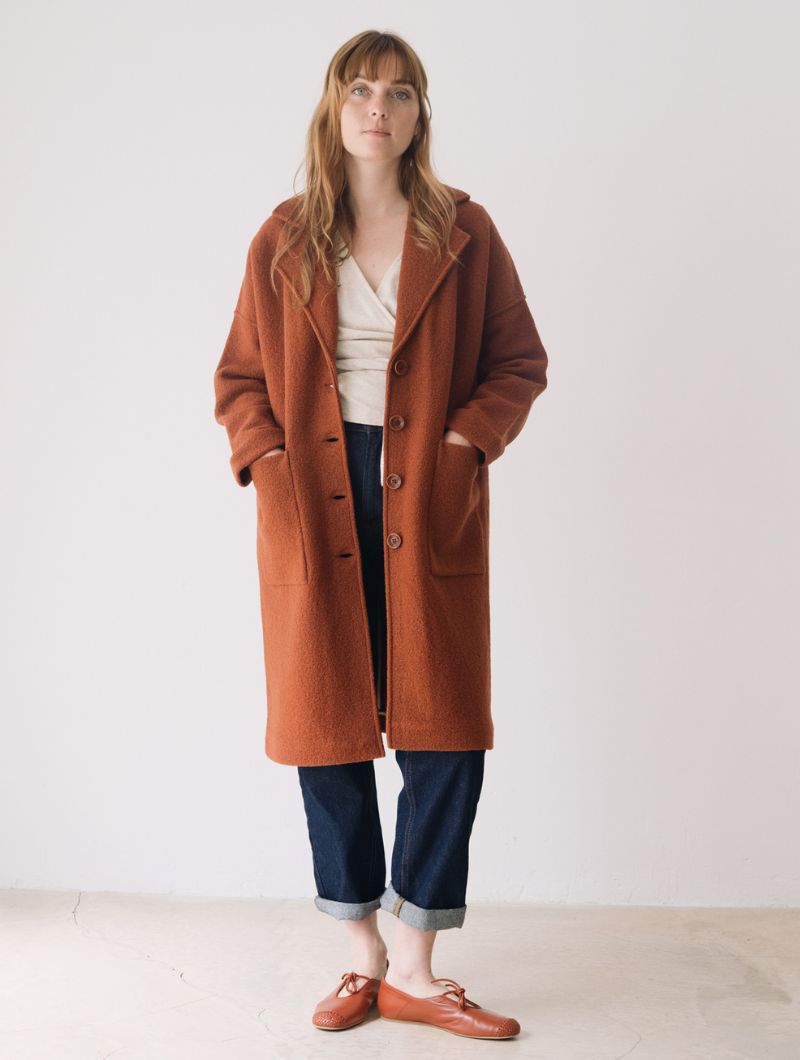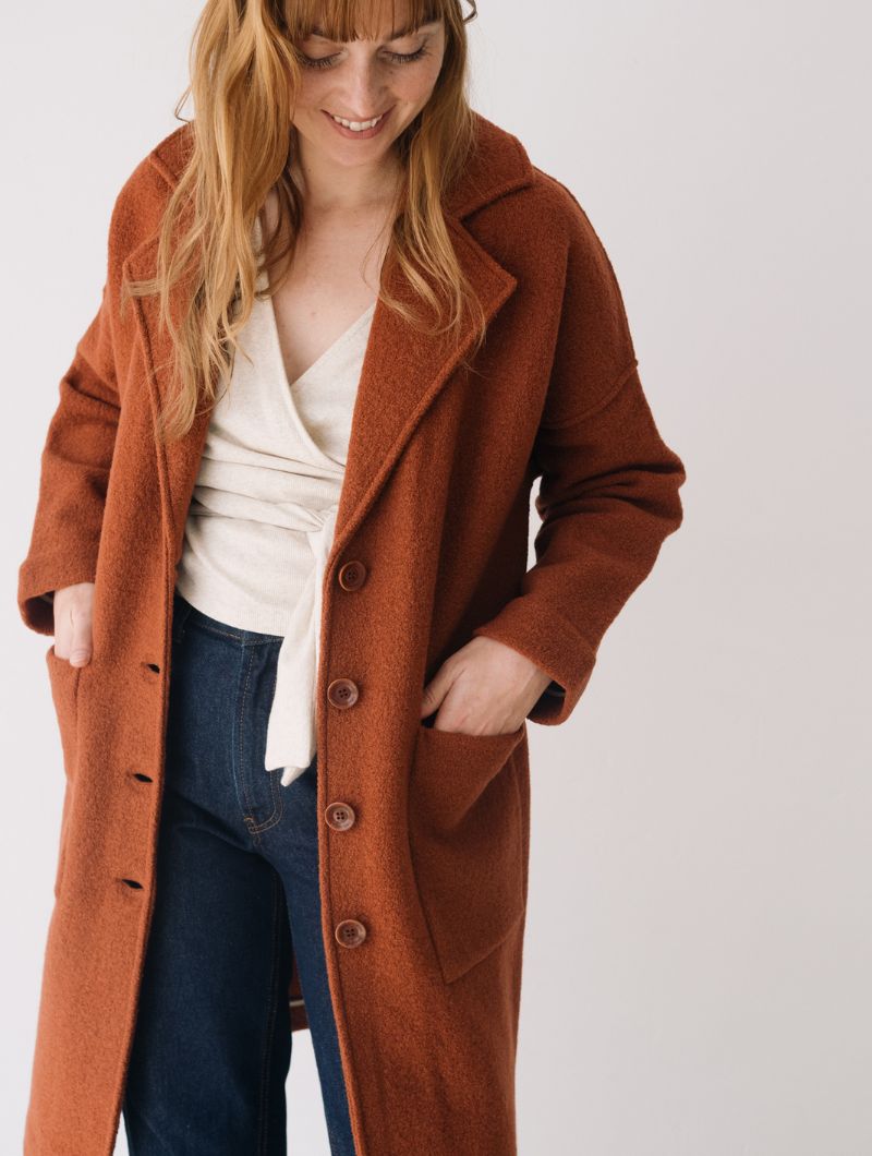 Abrigo largo en rojo amapola con silueta oversize, cuello solapa, hombro caído y bolsillos de plastón generosos. Con botones de corozo natural biodegradables.