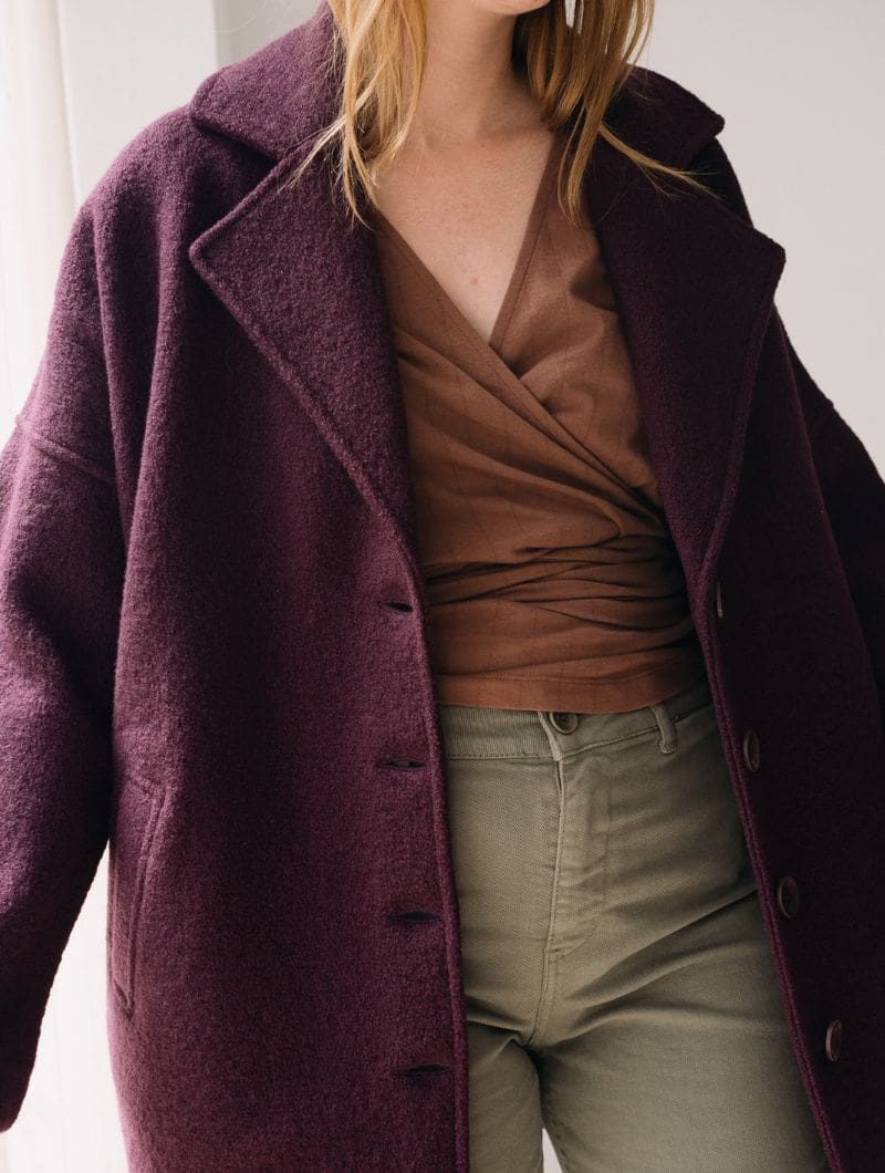 Abrigo oversize de corte medio con manga caída y botones de corozo natural, pensado para acompañarte durante muchísimos inviernos. Los interiores están rematados con un bies de algodón en contraste que aporta un acabado cuidado y resistente.
