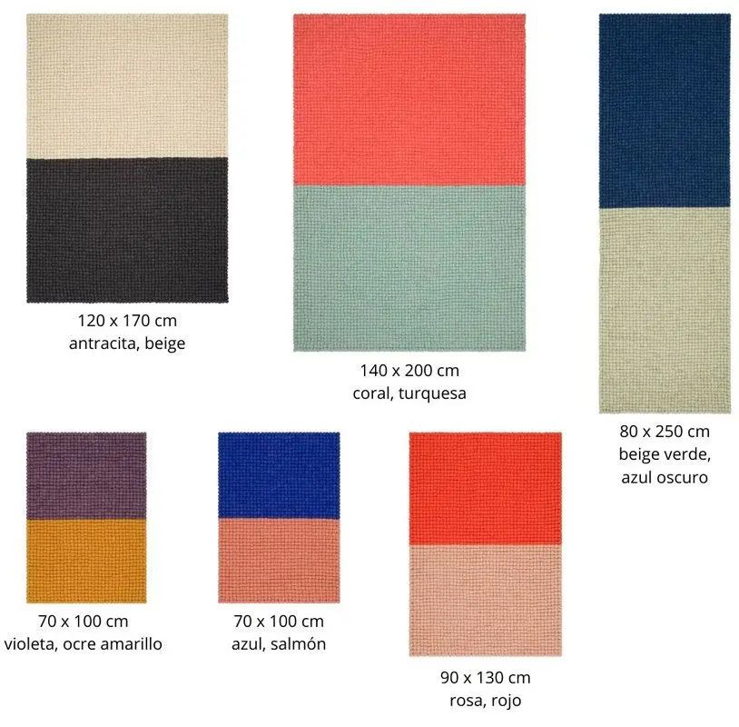 Tamaños y colores disponibles: Violeta + Ocre amarillo / 70 x 100 cm, Azul + Salmón / 70 x 100 cm, Rosa + Rojo / 90 x 130 cm, Antracita + Beige / 120 x 170 cm, Beige verde + azul oscuro / 80 x 250 cm, Coral + Turquesa / 140 x 200 cm*