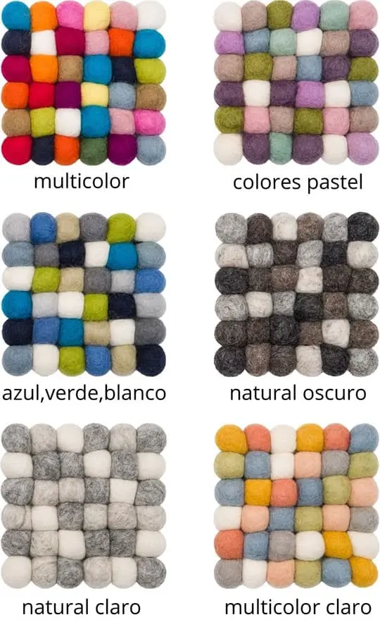 Alfombra de colores rectangular hecha con bolas de fieltro.