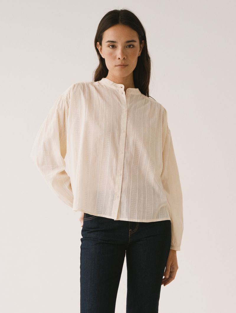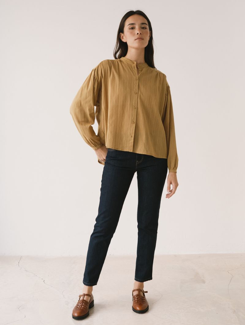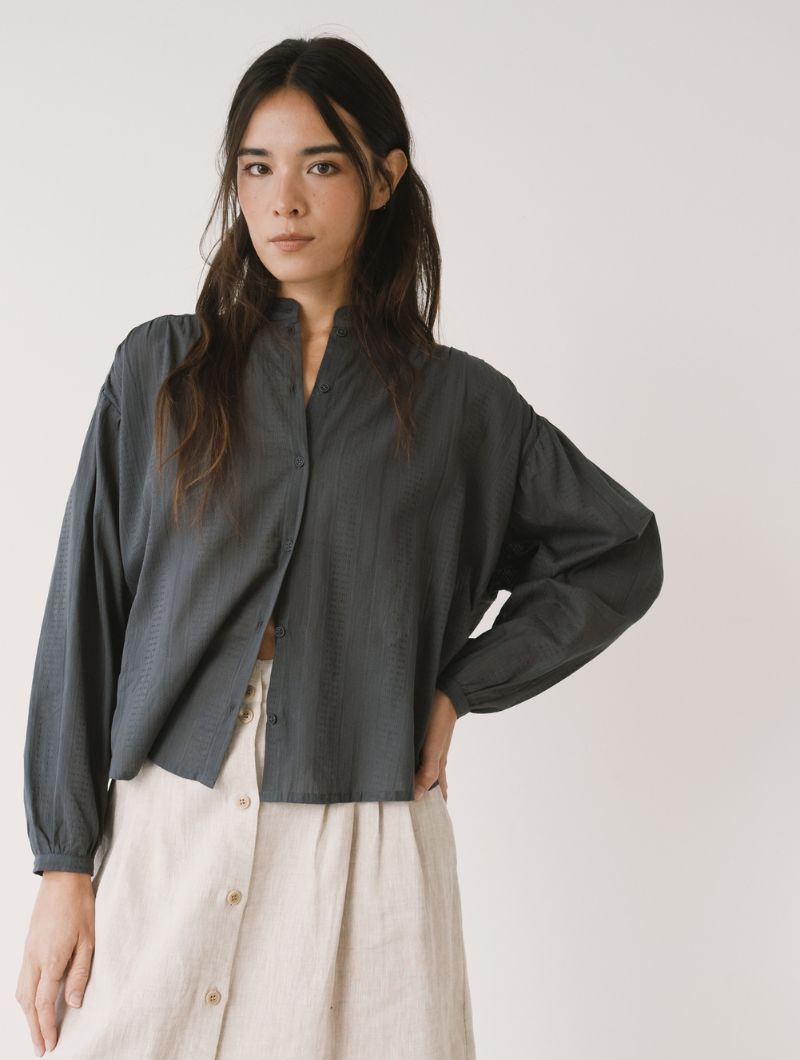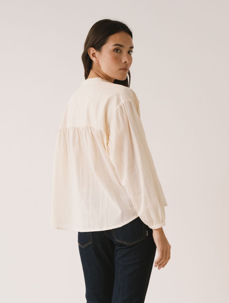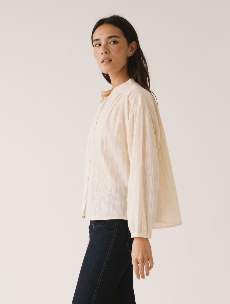 Blusa de corte amplio con cuello mao y cierre frontal abotonado, de líneas limpias en la parte delantera. La manga larga termina en puño con ligero frunce, manteniendo una silueta relajada.