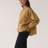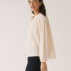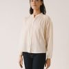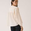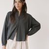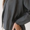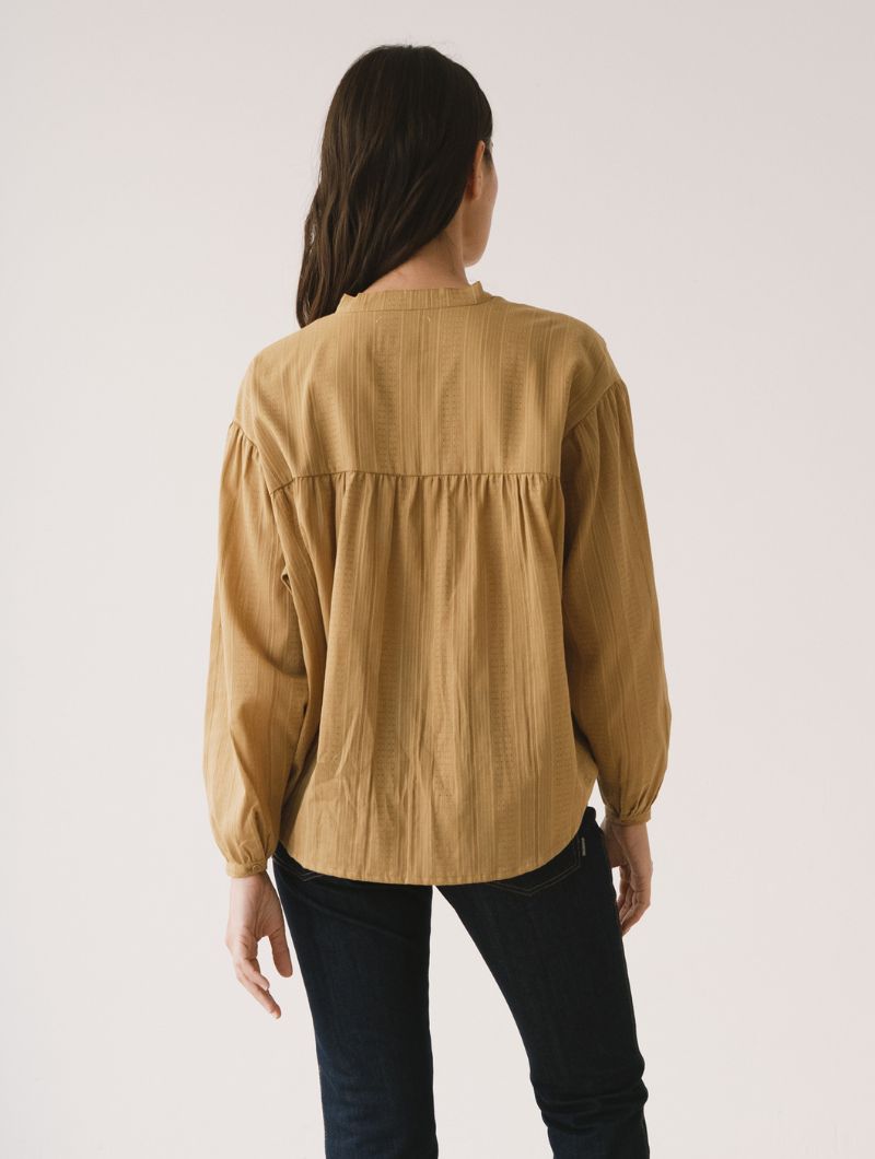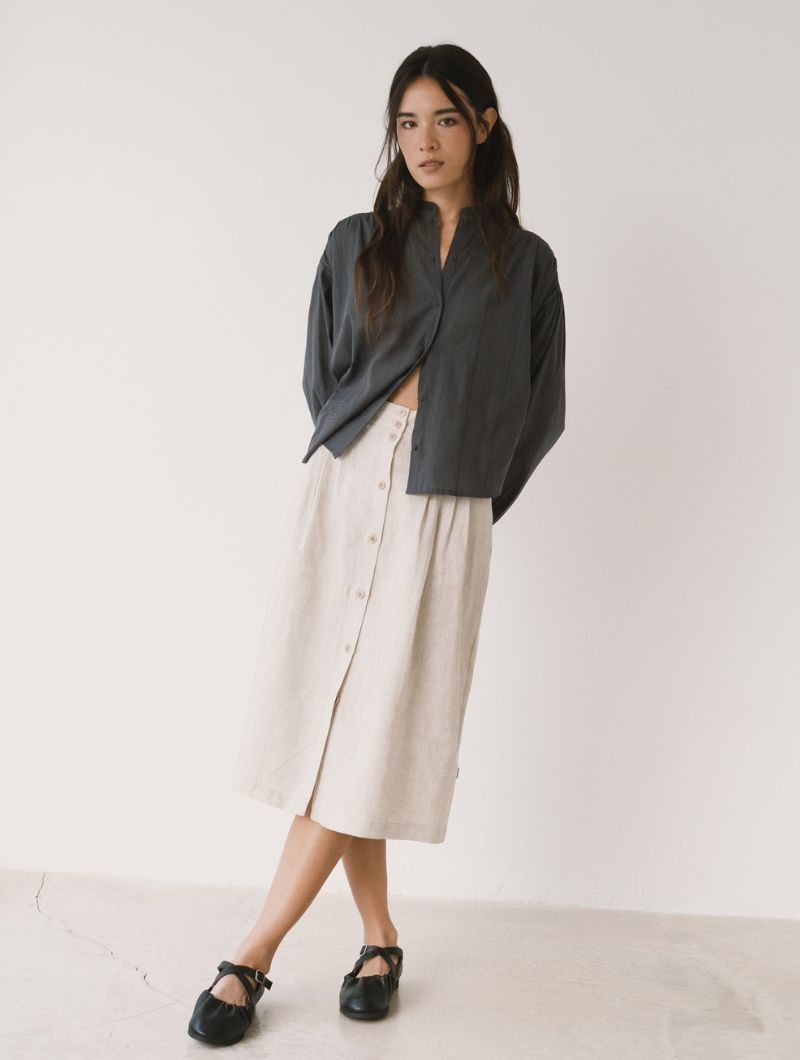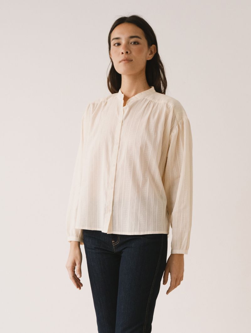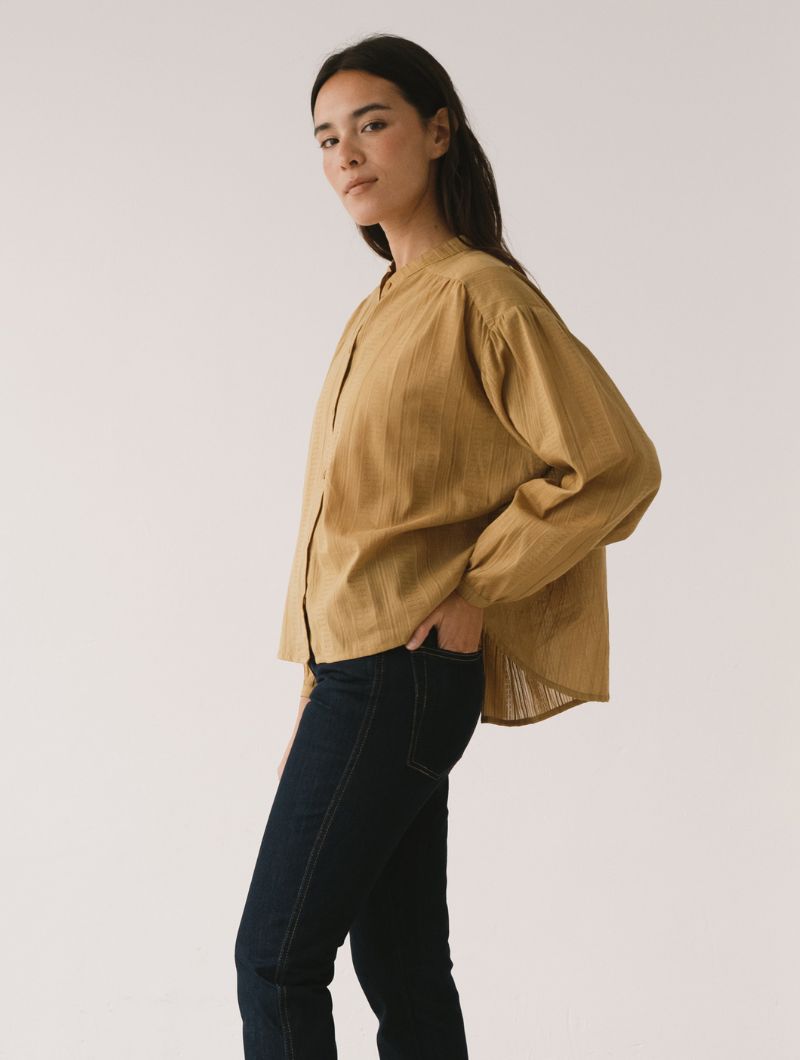 Blusa de corte amplio con cuello mao y cierre frontal abotonado, de líneas limpias en la parte delantera. La manga larga termina en puño con ligero frunce, manteniendo una silueta relajada.
