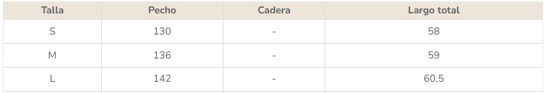 Consulta tabla con medidas en centímetros: