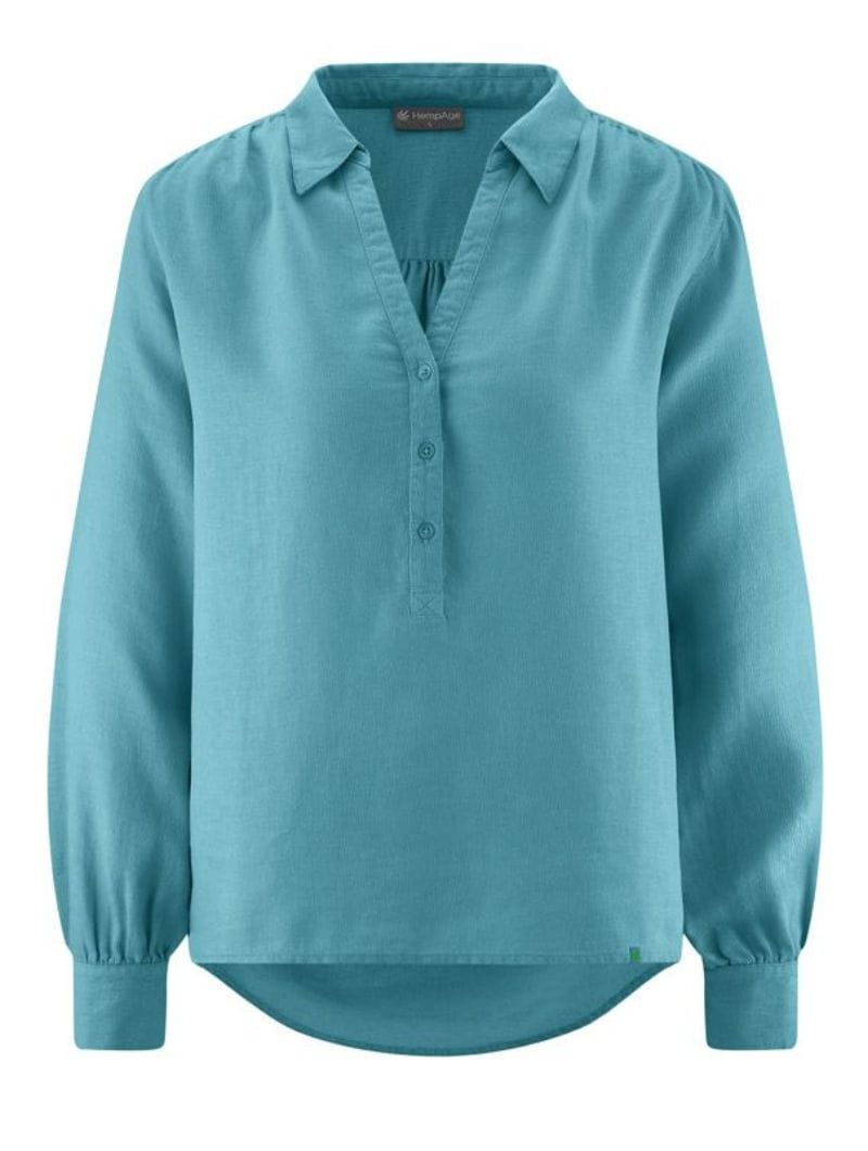 Confeccionada en una mezcla de 55% cáñamo y 45% algodón orgánico, esta blusa cuenta con la certificación Organic Content Standard (OCS), garantizando su sostenibilidad y respeto por el medio ambiente.