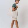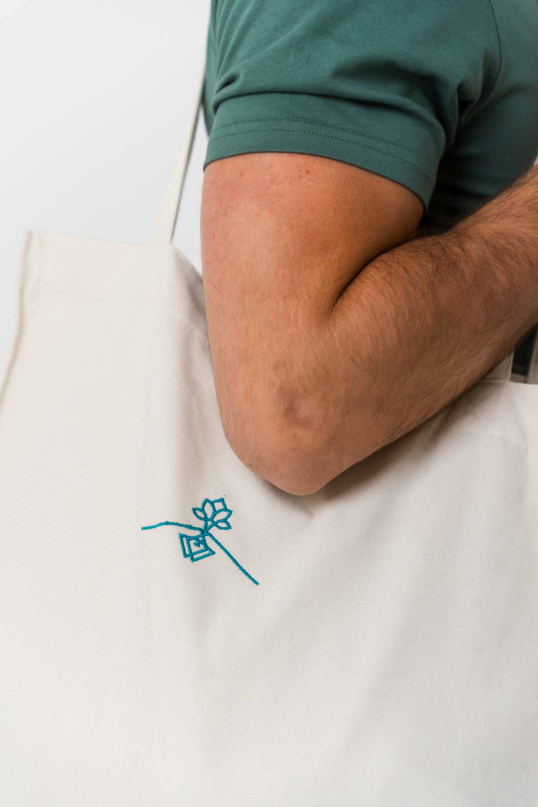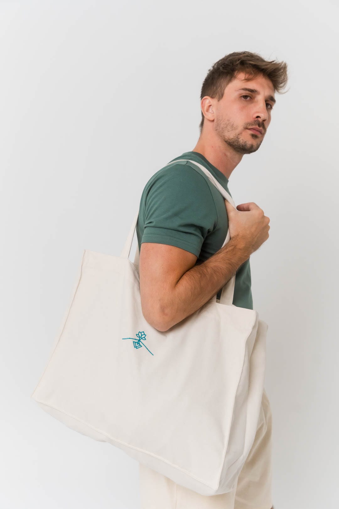 Bolsa de gran capacidad confeccionada con una mezcla de algodón reciclado (80%) y poliéster reciclado (20%). Su tejido tipo canvas es resistente y duradero, ideal para la compra, como bolsa de viaje o para llevar todo lo que necesitas sin esfuerzo. Incluye dos asas anchas que permiten llevarla cómodamente al hombro o en la mano.