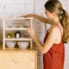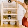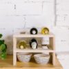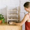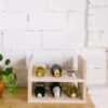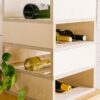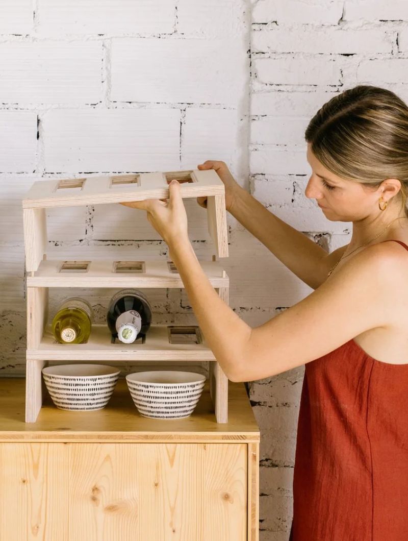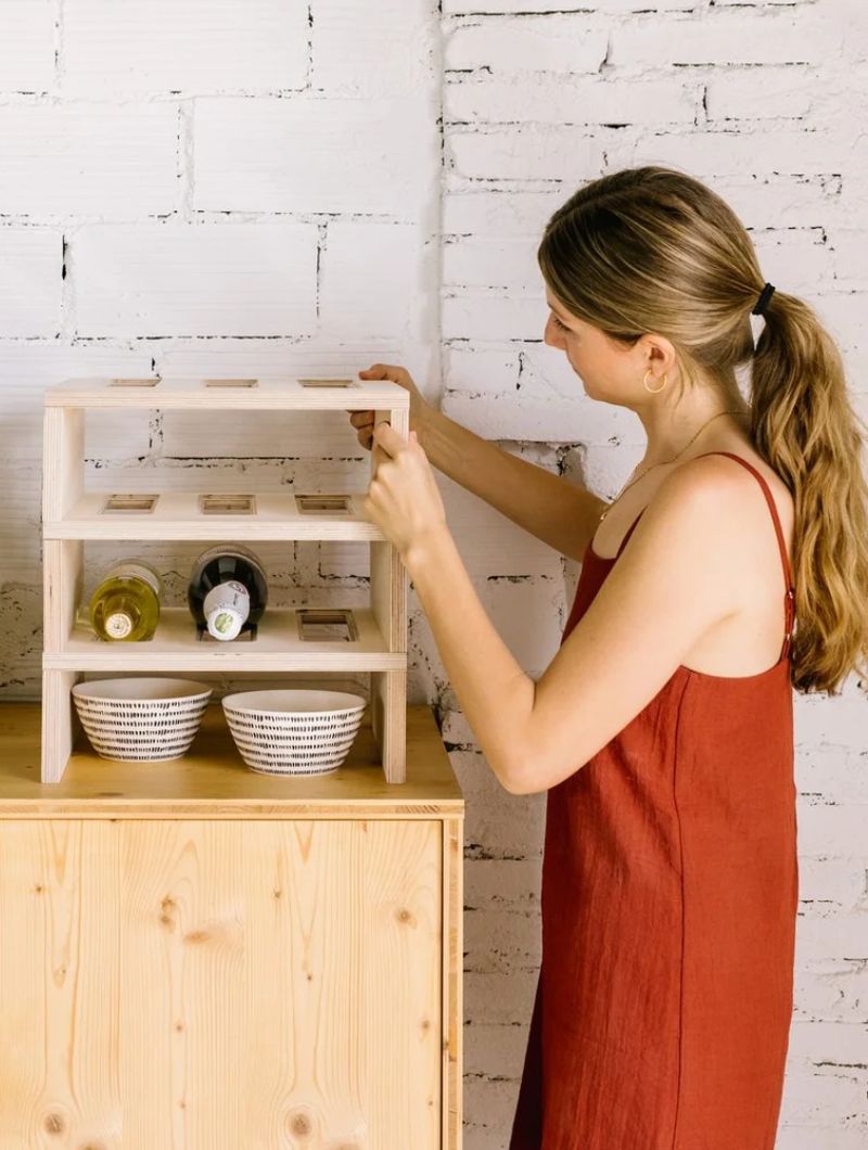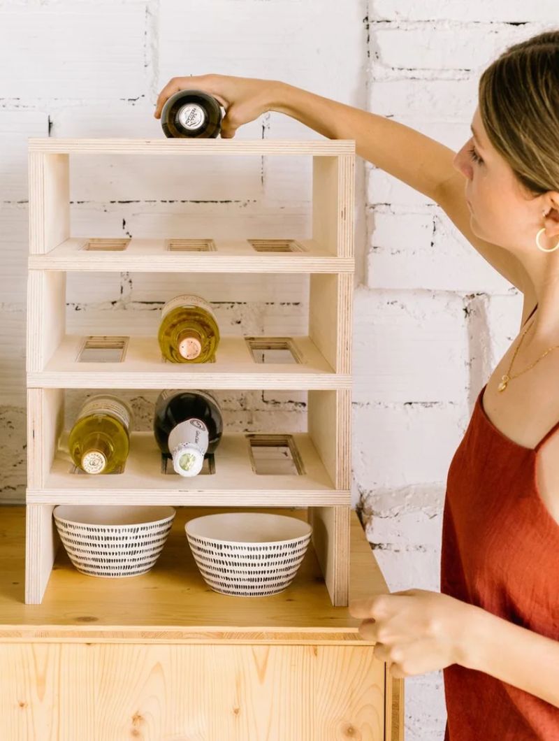 Su forma cuadrada permite colocarlo en cualquier dirección y jugar con el diseño: puede girarse para dejar las botellas en la parte superior y usar la inferior como espacio de almacenamiento adicional. Cada módulo se vende por separado e incluye cuatro espigas para poder añadir más niveles en cualquier momento.
