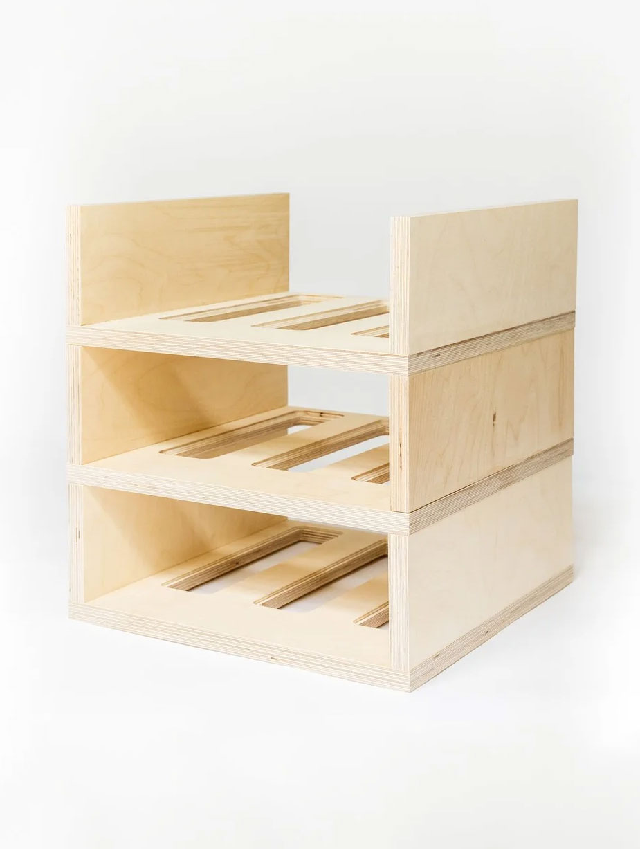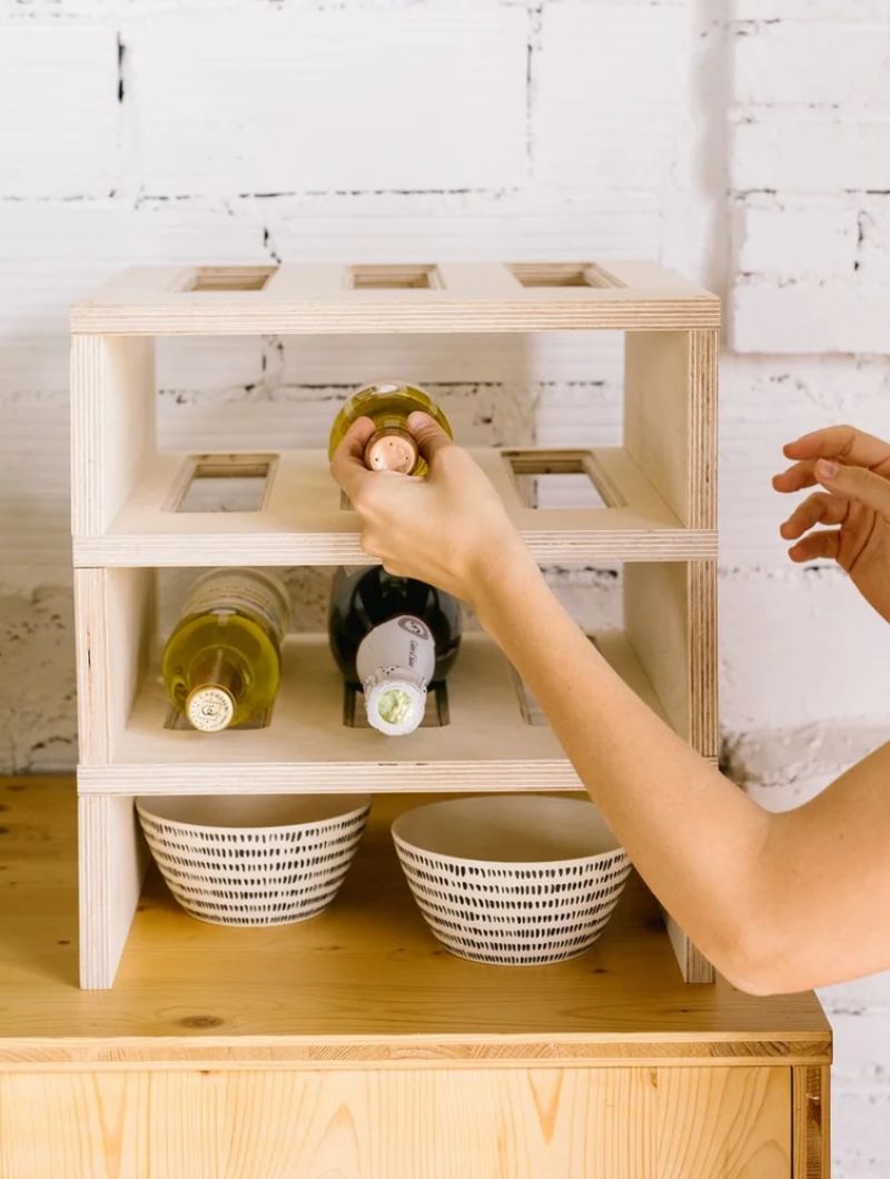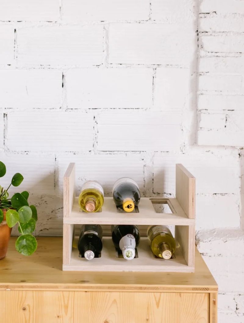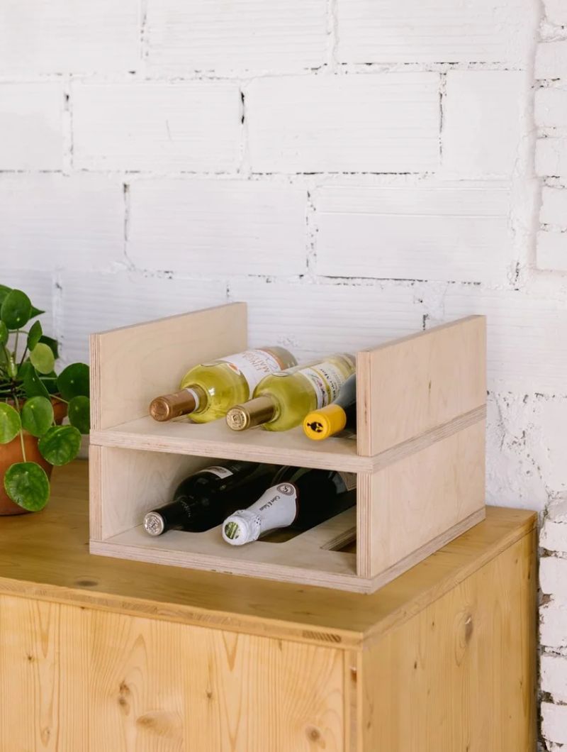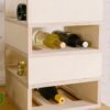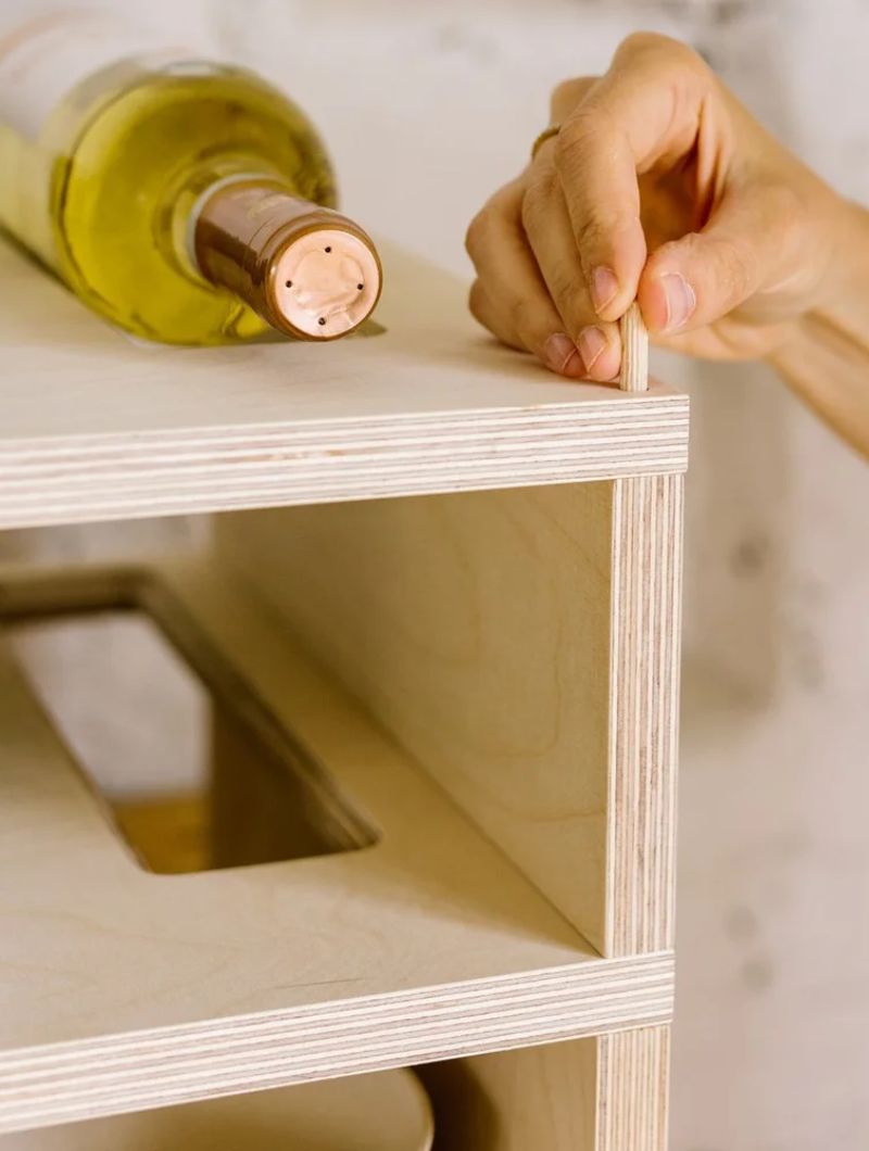Botellero de madera con diseño apilable y capacidad para tres botellas de vino o cava por piso. Las botellas encajan en las ranuras para mantenerse firmes y en posición horizontal, mientras que los pisos se unen entre sí mediante espigas de madera, sin necesidad de tornillos ni herramientas.