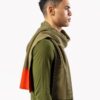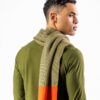 El punto de alta calidad le aporta suavidad y estructura, mientras que los bloques de color en los extremos —naranja sobre verde musgo, azul claro sobre azul oscuro— añaden un contraste elegante y actual.