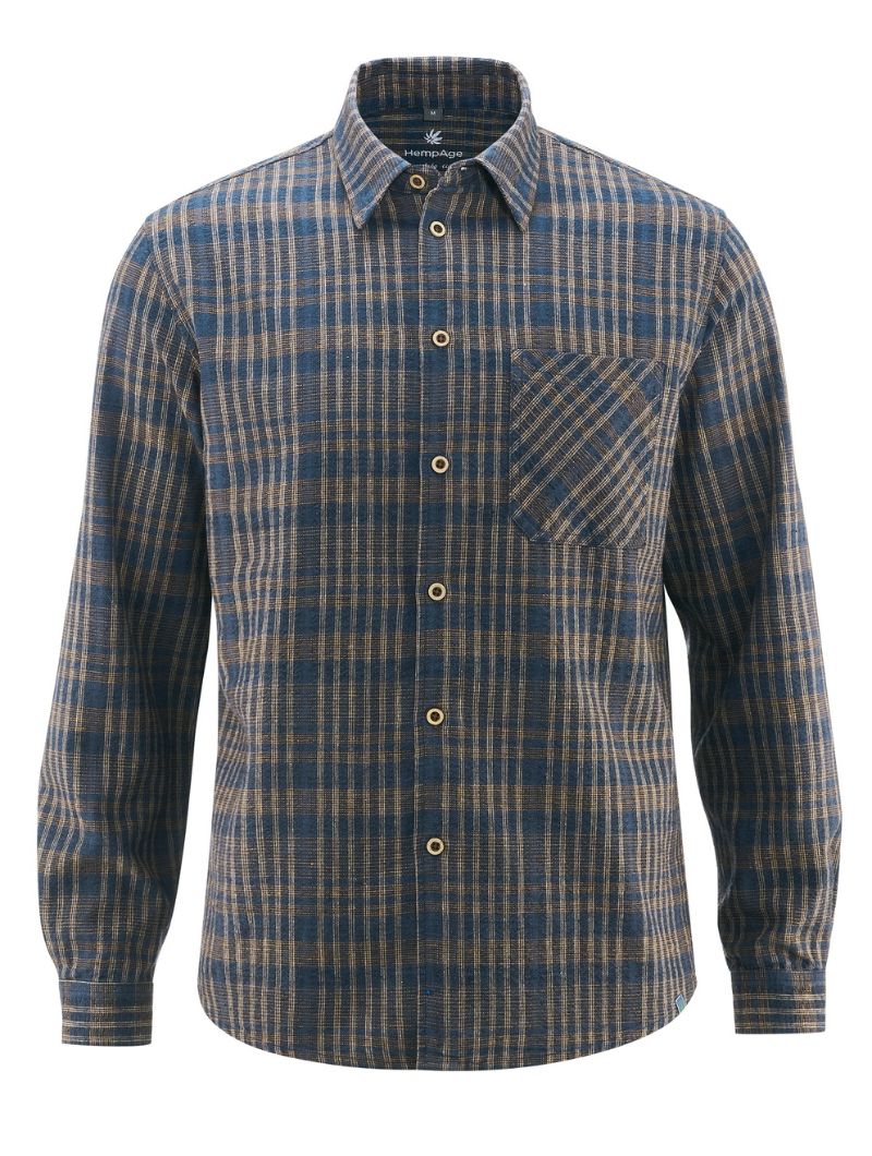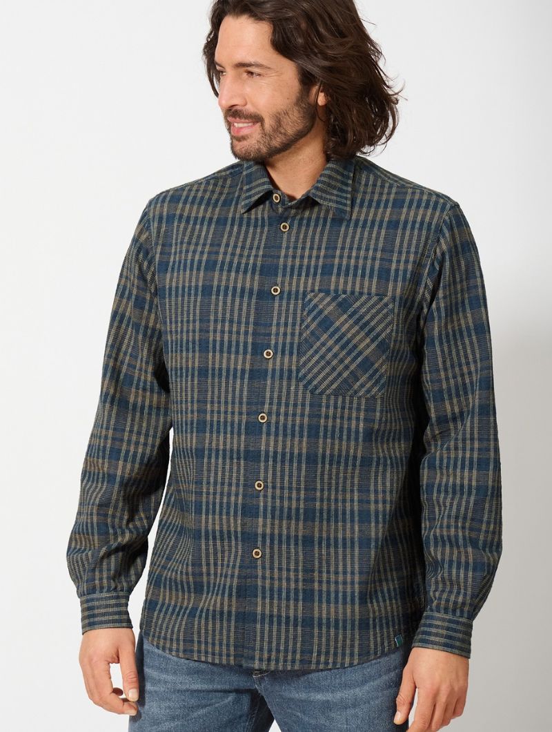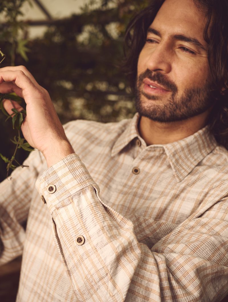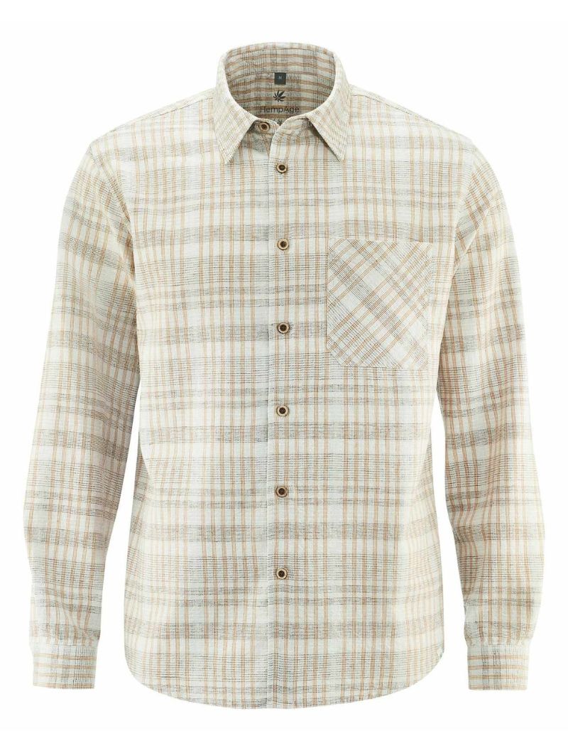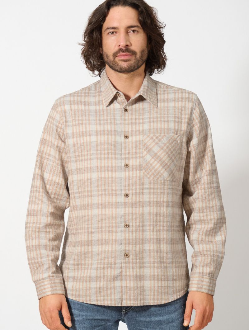 Camisa de corte relajado confeccionada con 55% cáñamo y 45% algodón orgánico, un tejido ligero y transpirable que aporta comodidad durante todo el día. Su diseño de cuadros en tonos terrosos, con textura de efecto seersucker, aporta carácter y un aire natural. Los botones de coco completan un acabado cuidado y auténtico.