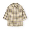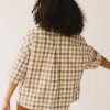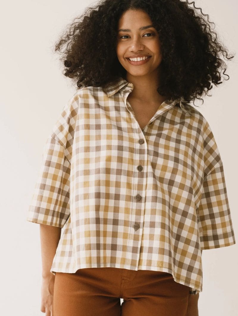 Camisa de manga corta con estampado de cuadros vichy en mostaza, marrón y crudo. Corte crop, fit cuadrado oversize, manga caída y botones de corozo teñidos al tono.
