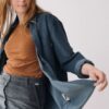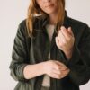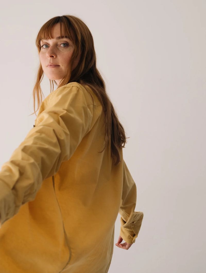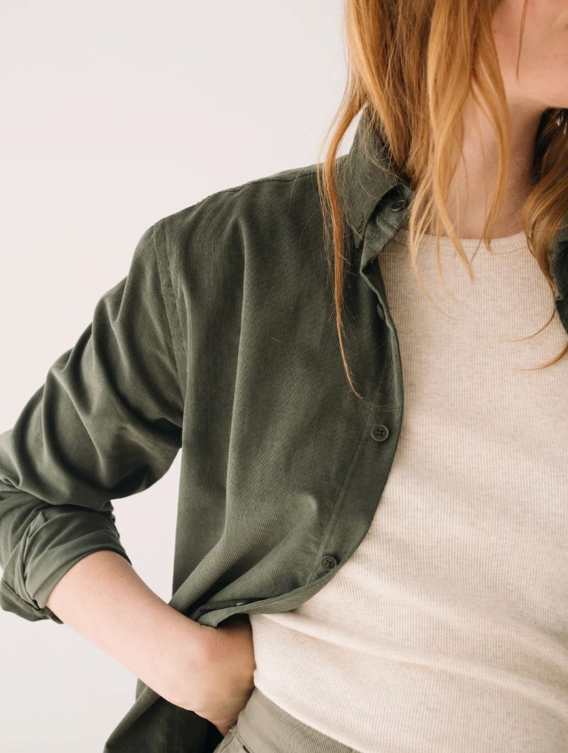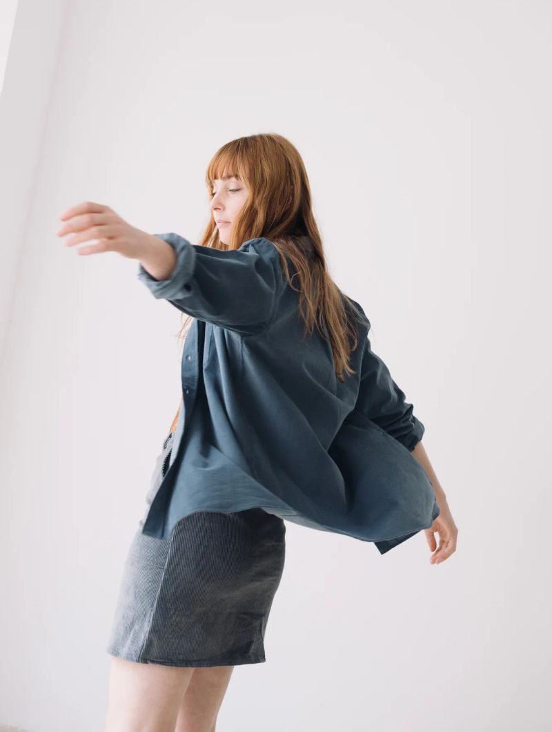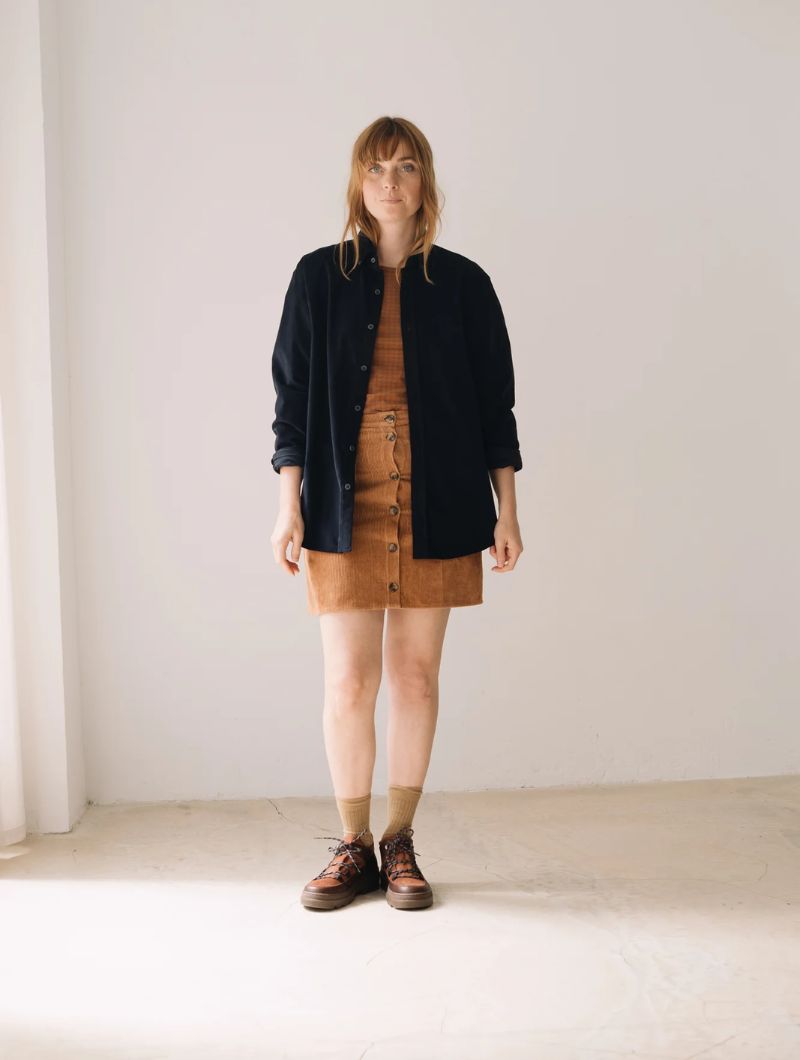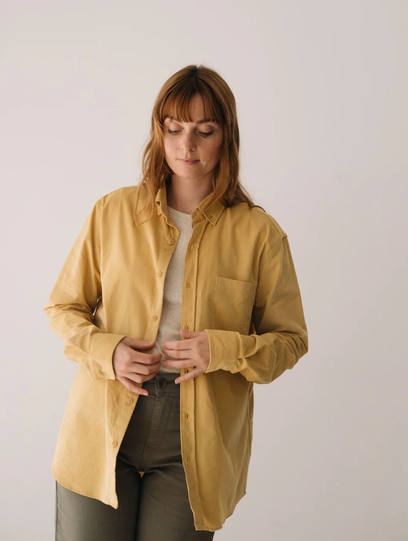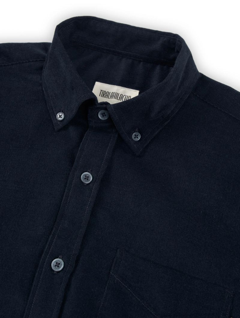 El diseño, de corte recto y estilo atemporal, incluye cuello abotonado, bolsillo en el pecho y botones de corozo natural, una alternativa vegetal y biodegradable que aporta un acabado cuidado y auténtico.