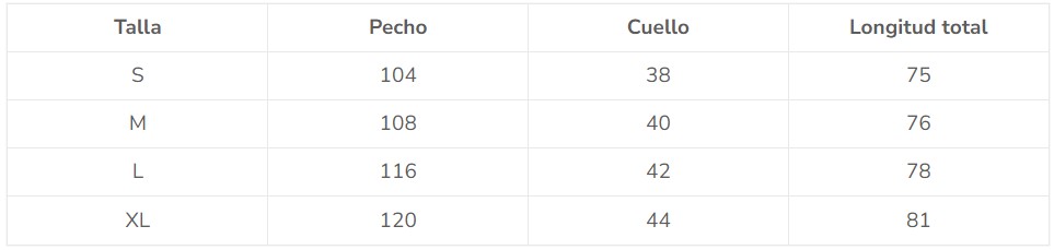 Las medidas están especificadas en centímetros. La producción se realiza de forma manual, por lo que puede haber pequeñas variaciones. Compara estas dimensiones con tu contorno de pecho, cuello y con tu altura.