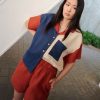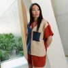 Esta camisa de lino presenta un original diseño color block con cuello en pico, bolsillo frontal y botones de madera de olivo.