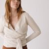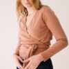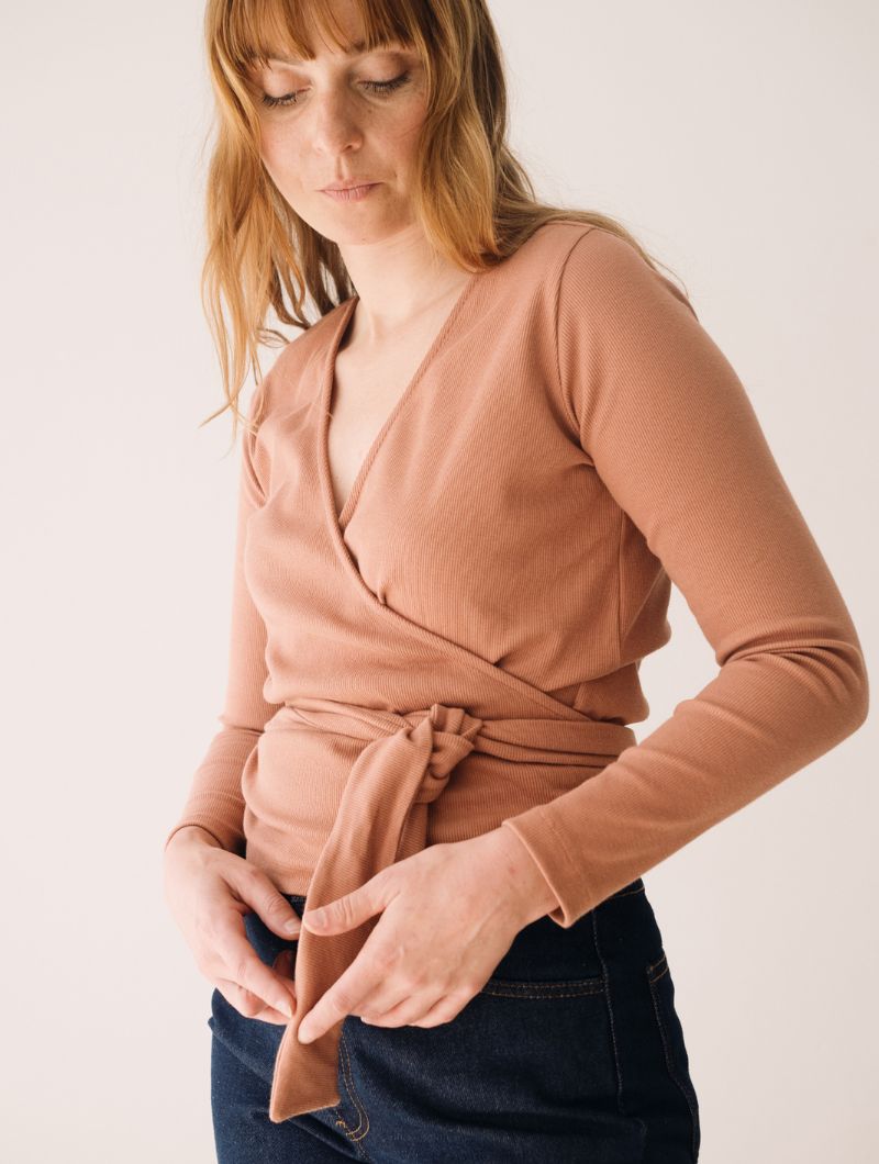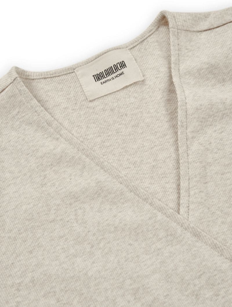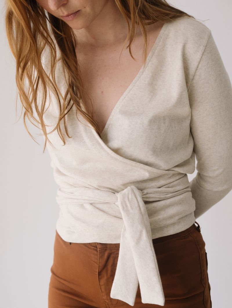 Camiseta cruzada de canalé con diseño envolvente, escote en pico y lazo a la cintura que permite ajustarla cómodamente y estilizar la silueta.