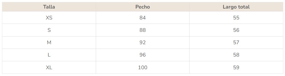 Las medidas están especificadas en centímetros. La producción se realiza de forma manual, por lo que puede haber pequeñas variaciones. Compara estas dimensiones con tu contorno de pecho y con tu altura.