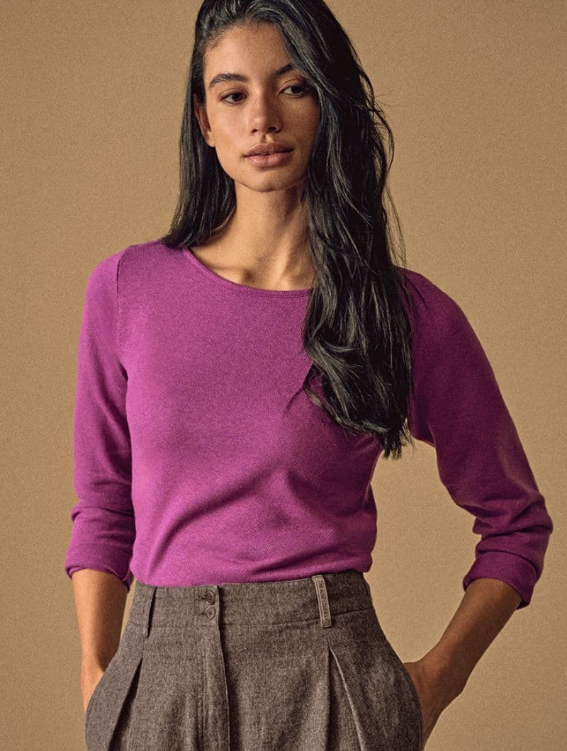 La camiseta cuello barco violeta de manga larga es la opción ideal para quienes buscan un diseño elegante y cómodo.