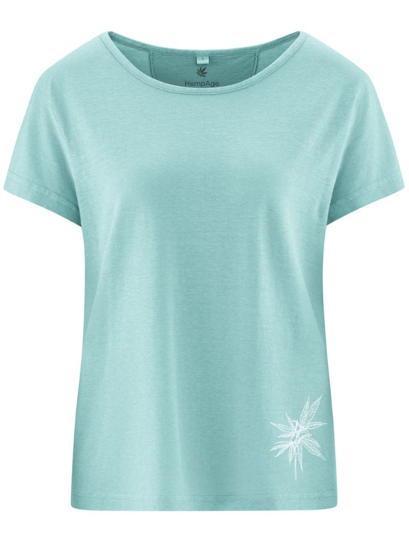 Camiseta estampada de corte casual con un diseño sencillo y natural. El estampado de hoja de cáñamo en la cadera aporta un detalle sutil y original.