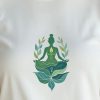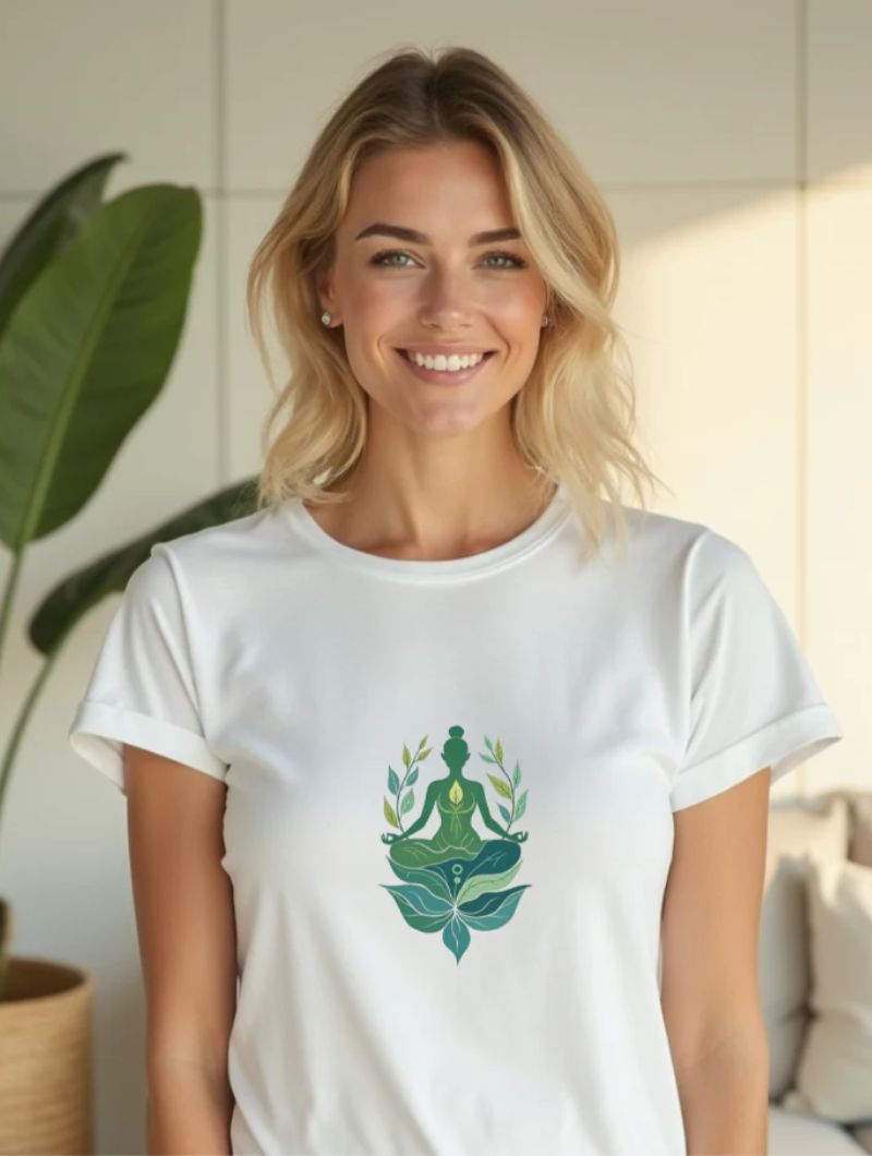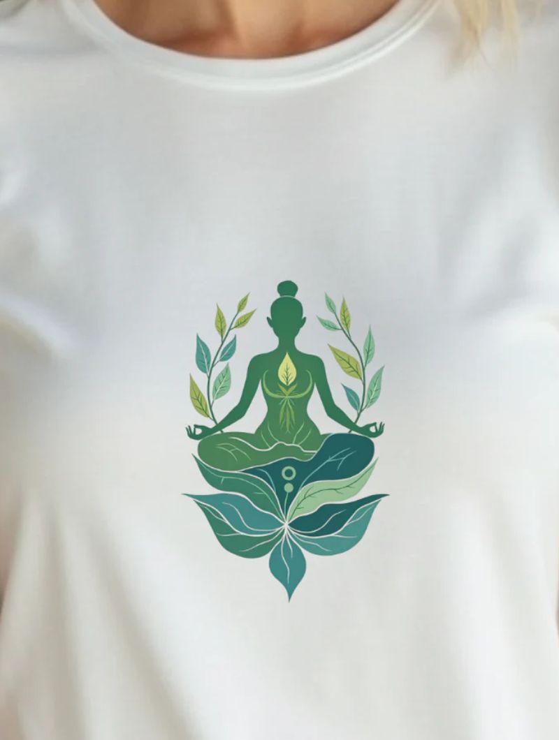 En el pecho aparece una ilustración de una figura en meditación rodeada de hojas, un diseño inspirado en la calma, la naturaleza y los momentos en los que bajamos el ritmo. Una camiseta sencilla, con un dibujo que transmite equilibrio sin resultar recargado.