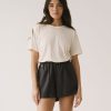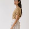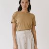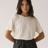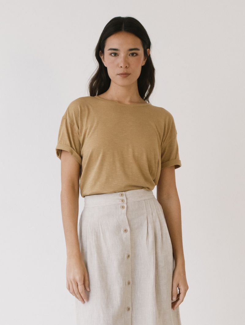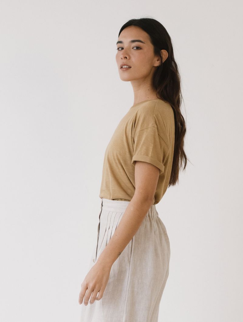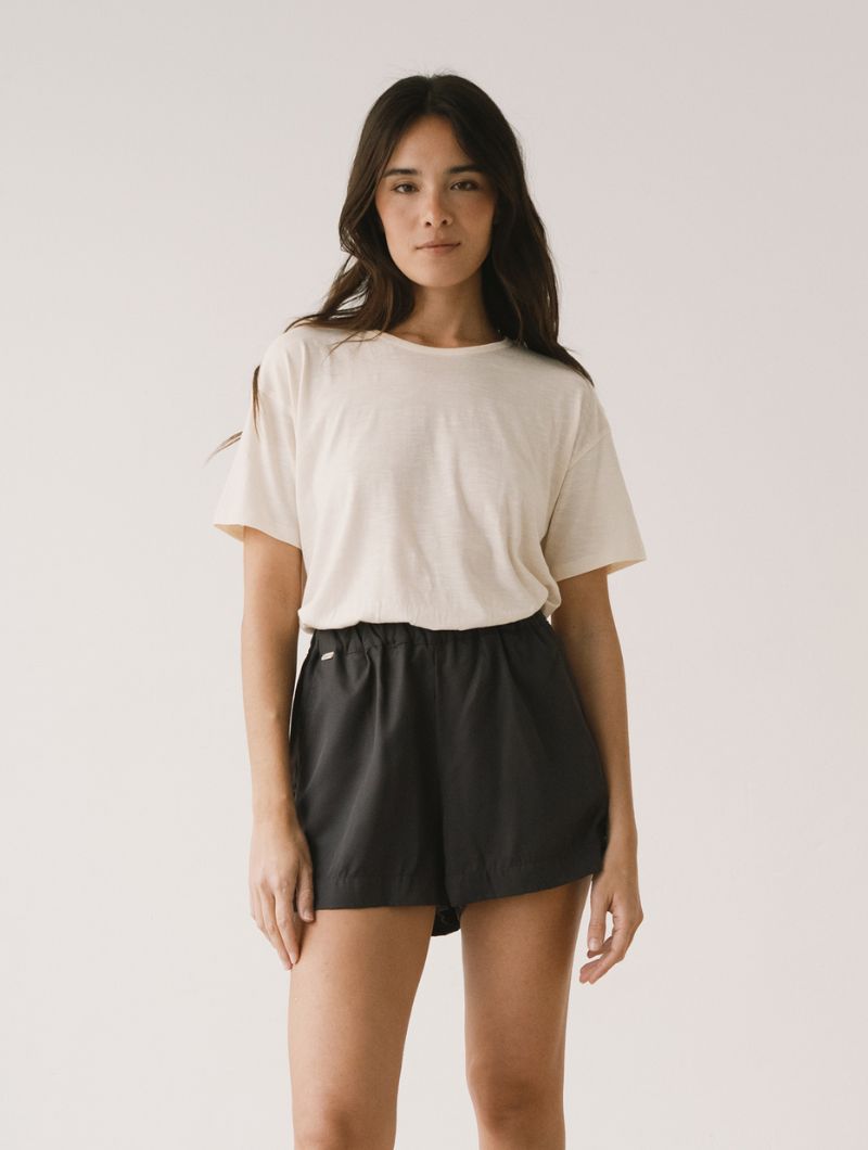 Camiseta lisa de silueta relajada, con hombro ligeramente caído y manga corta que aporta una caída natural sin marcar. El cuello redondo y limpio refuerza un diseño sencillo y fácil de combinar.