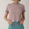 El corte es ligeramente cropped, con una caída recta que se separa suavemente del cuerpo, permitiendo combinarla fácilmente con prendas de tiro alto. La manga corta y el punto fino hacen que resulte ligera y cómoda para los meses más cálidos.