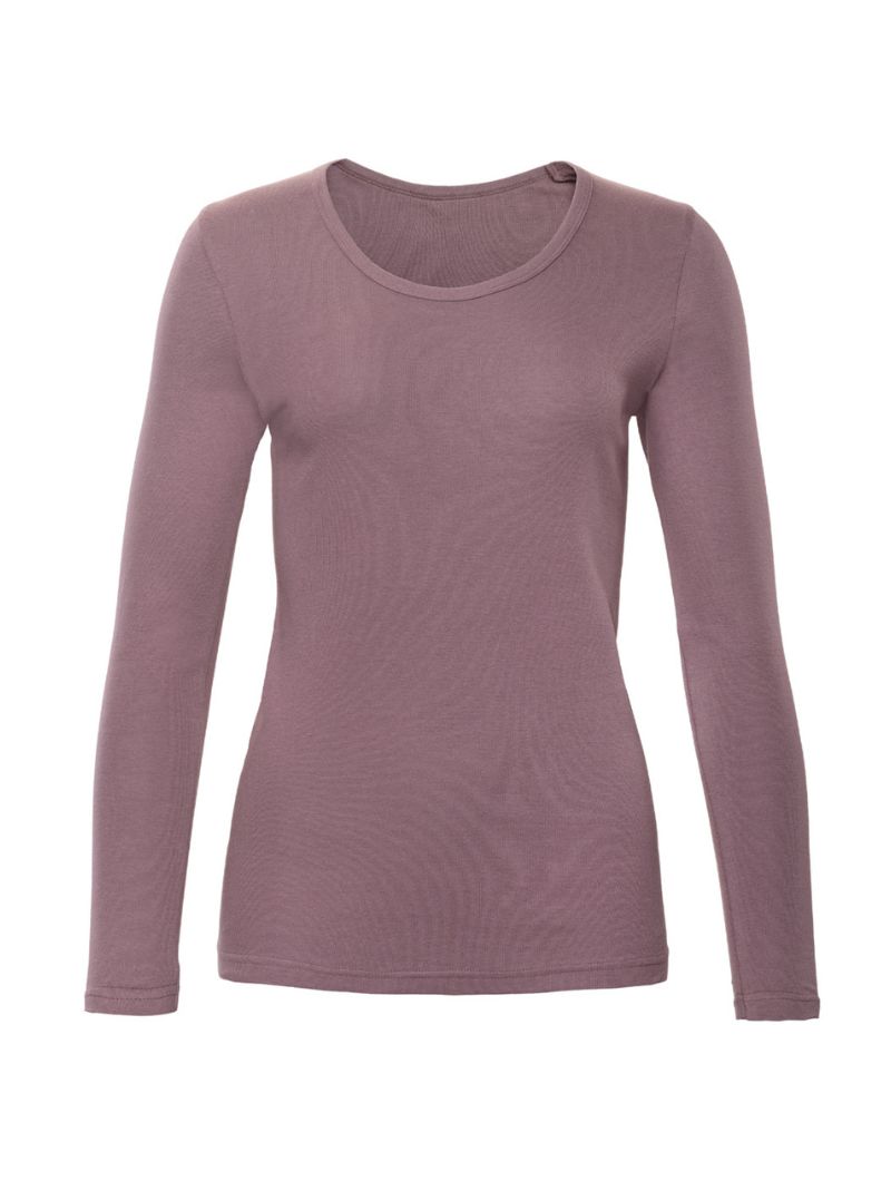 Con un profundo cuello redondo y acabados de doble costura en la cintura y mangas, esta prenda básica está disponible en varios colores: natural, malva y negro.