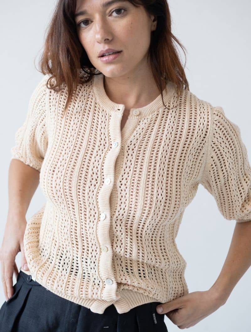 Cárdigan calado de estilo atemporal, tejido en punto fino con tacto suave y agradable. Ideal para entretiempo o noches frescas de verano.