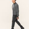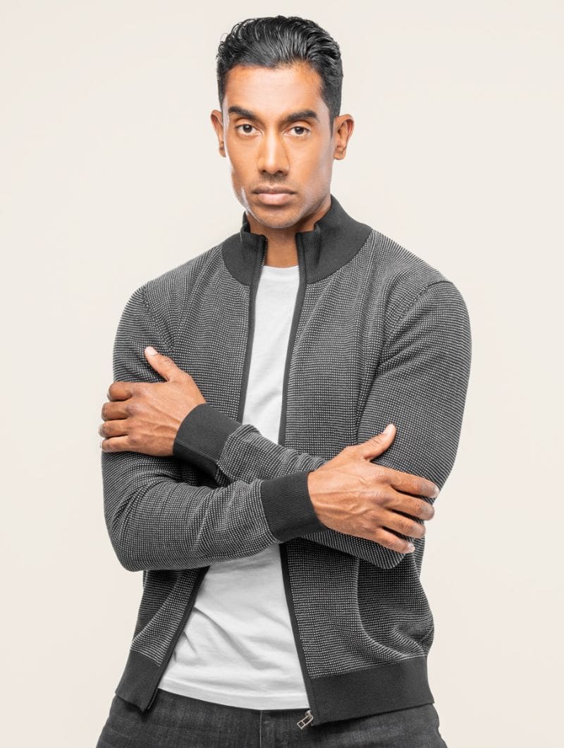 Tiene un diseño jaspeado con pequeños contrastes y un cuello alto de canalé que abriga sin resultar pesado. La cremallera metálica le da un aire práctico y robusto, mientras que los puños en canalé mantienen la forma y aportan comodidad.