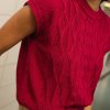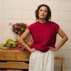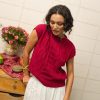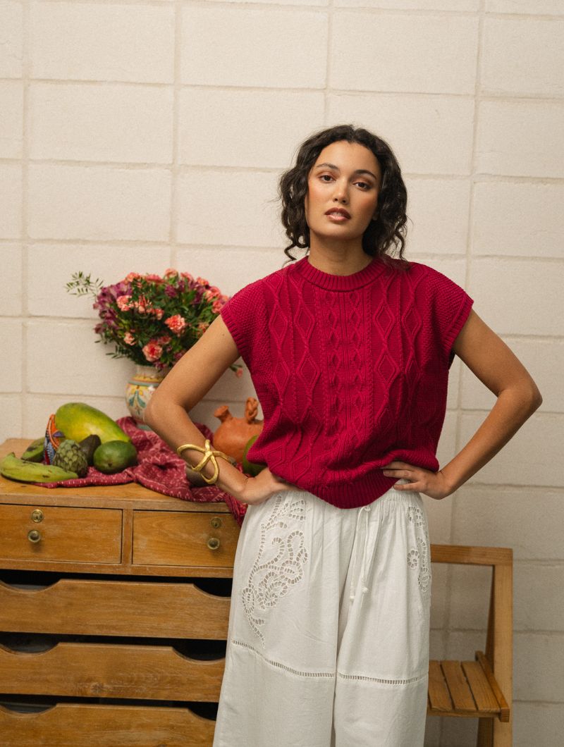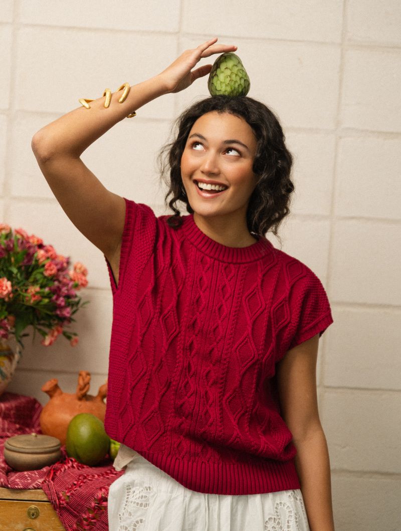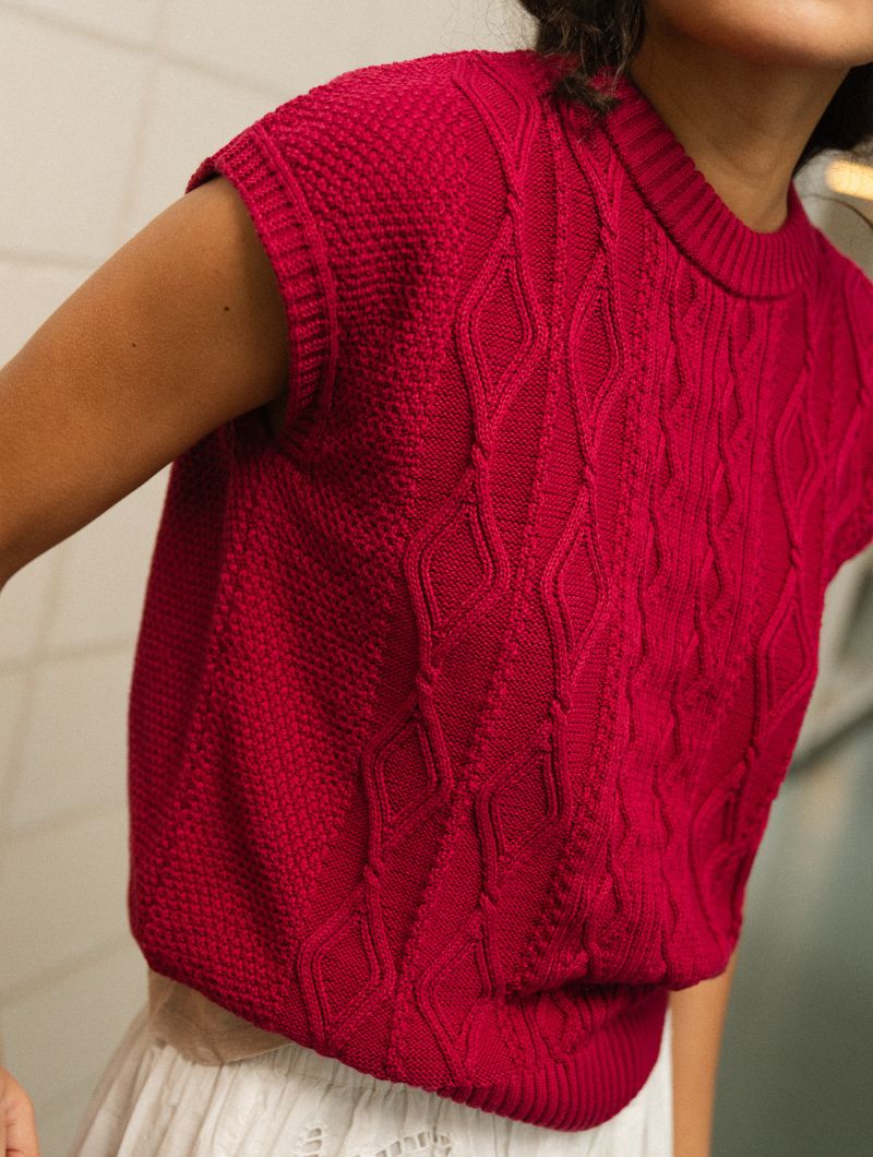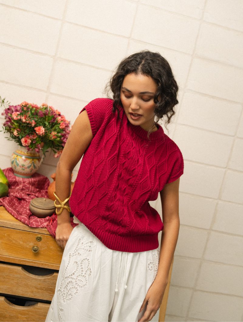 Chaleco de punto de arroz en color amarena, un rojo cereza profundo muy especial. El tejido combina punto de arroz y trenzas, creando una textura con relieve que lo hace único.