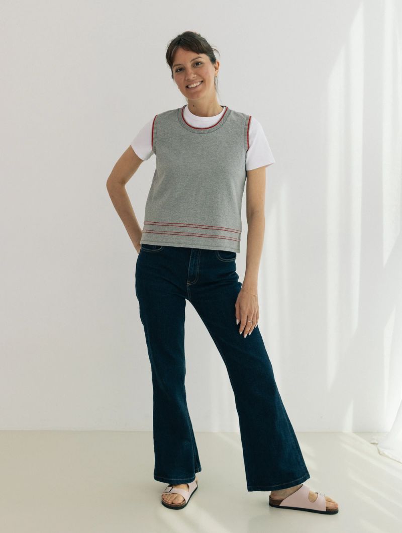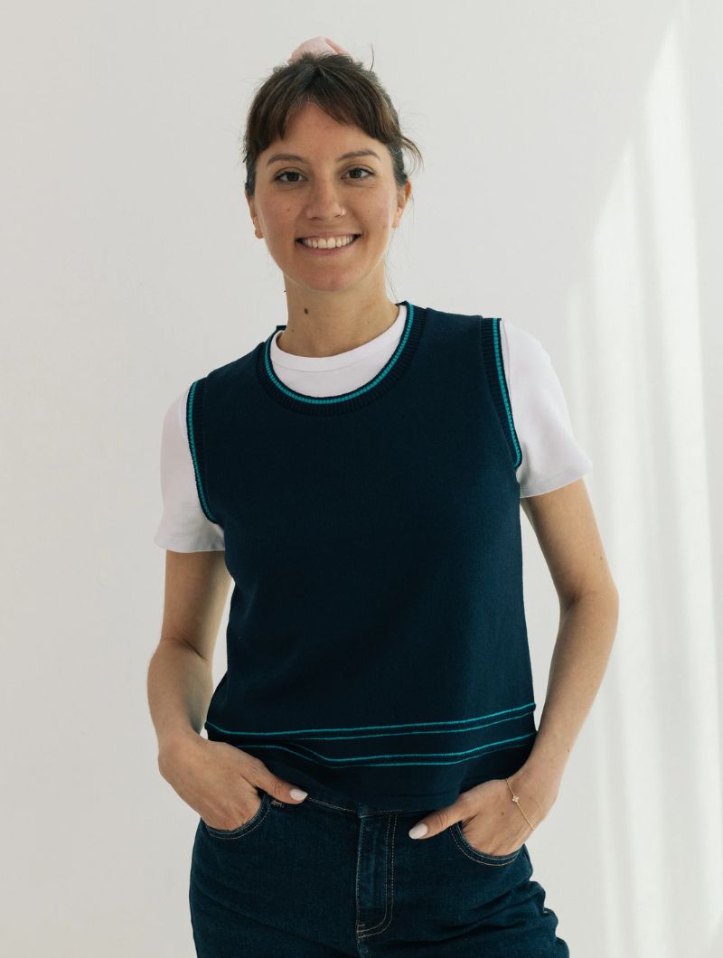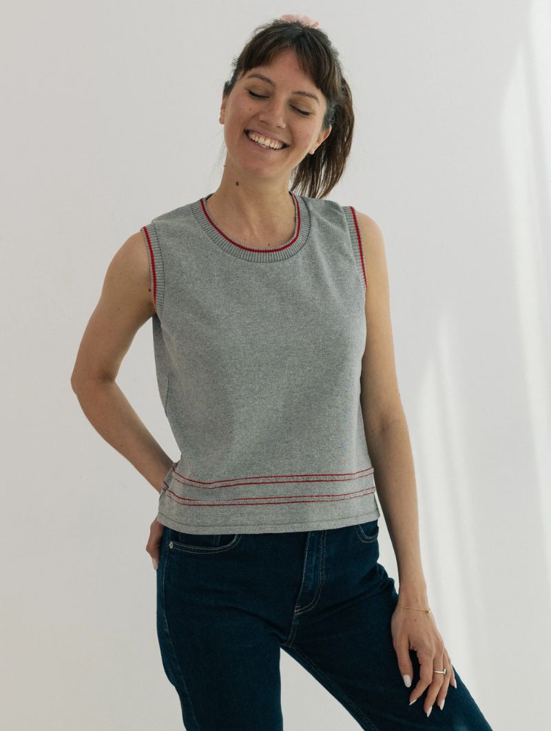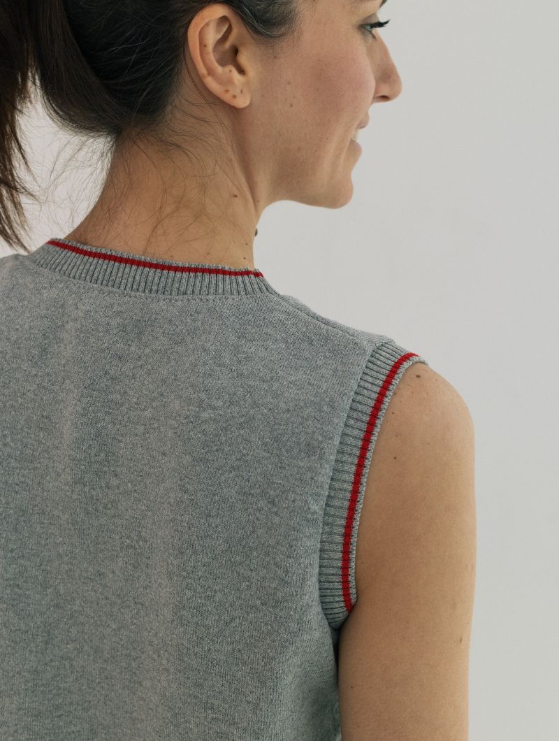 Chaleco de punto sin mangas de diseño liso y líneas limpias, con silueta recta y ajuste relajado que se adapta sin ceñir. El protagonismo recae en los ribetes en contraste que recorren cuello, sisas y bajo, aportando definición y un detalle gráfico sutil.