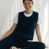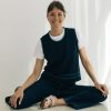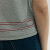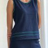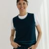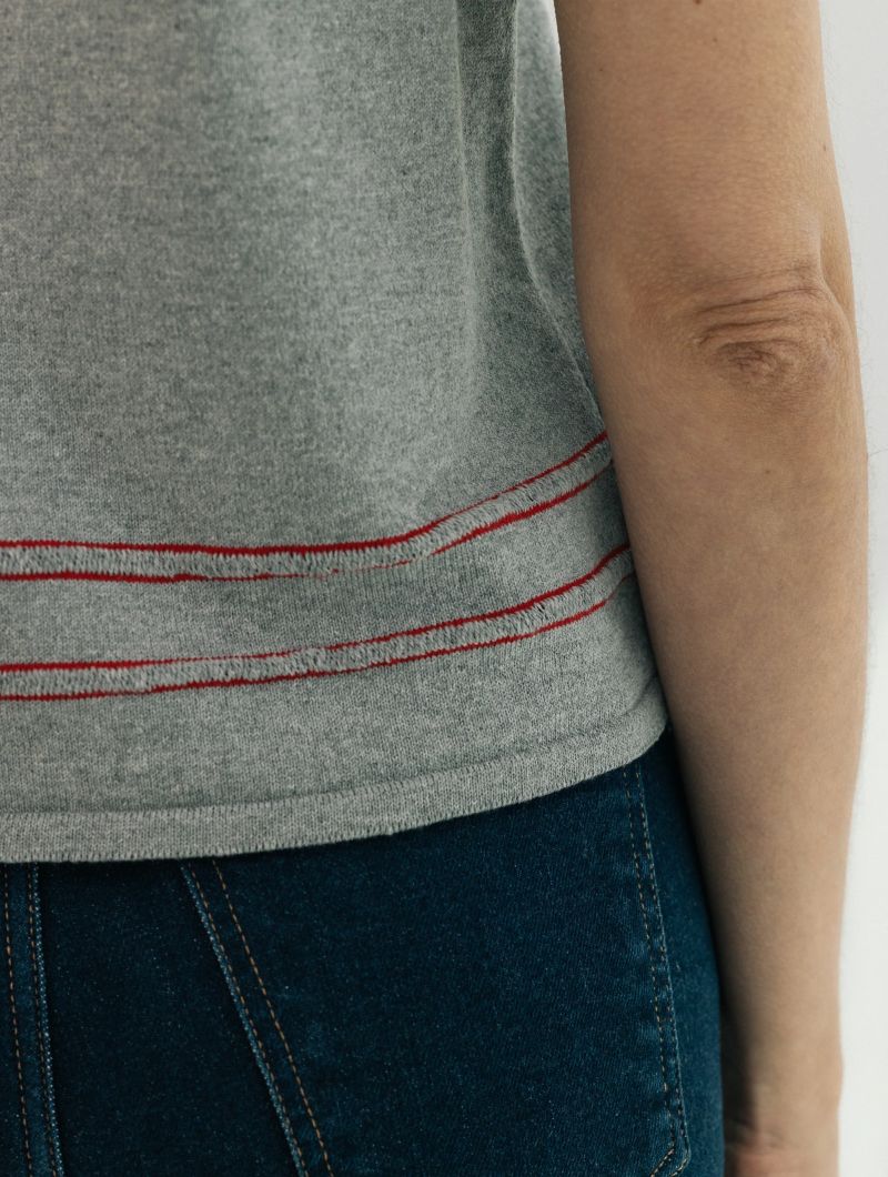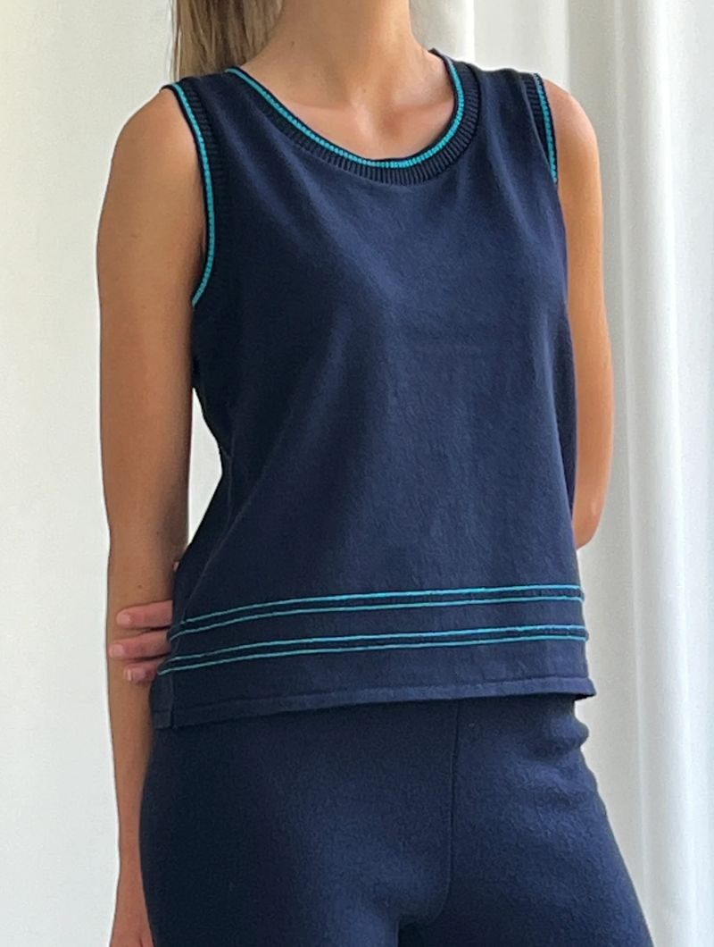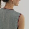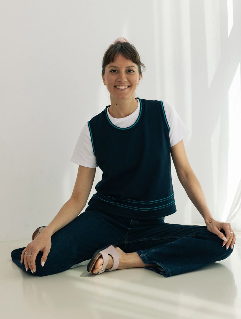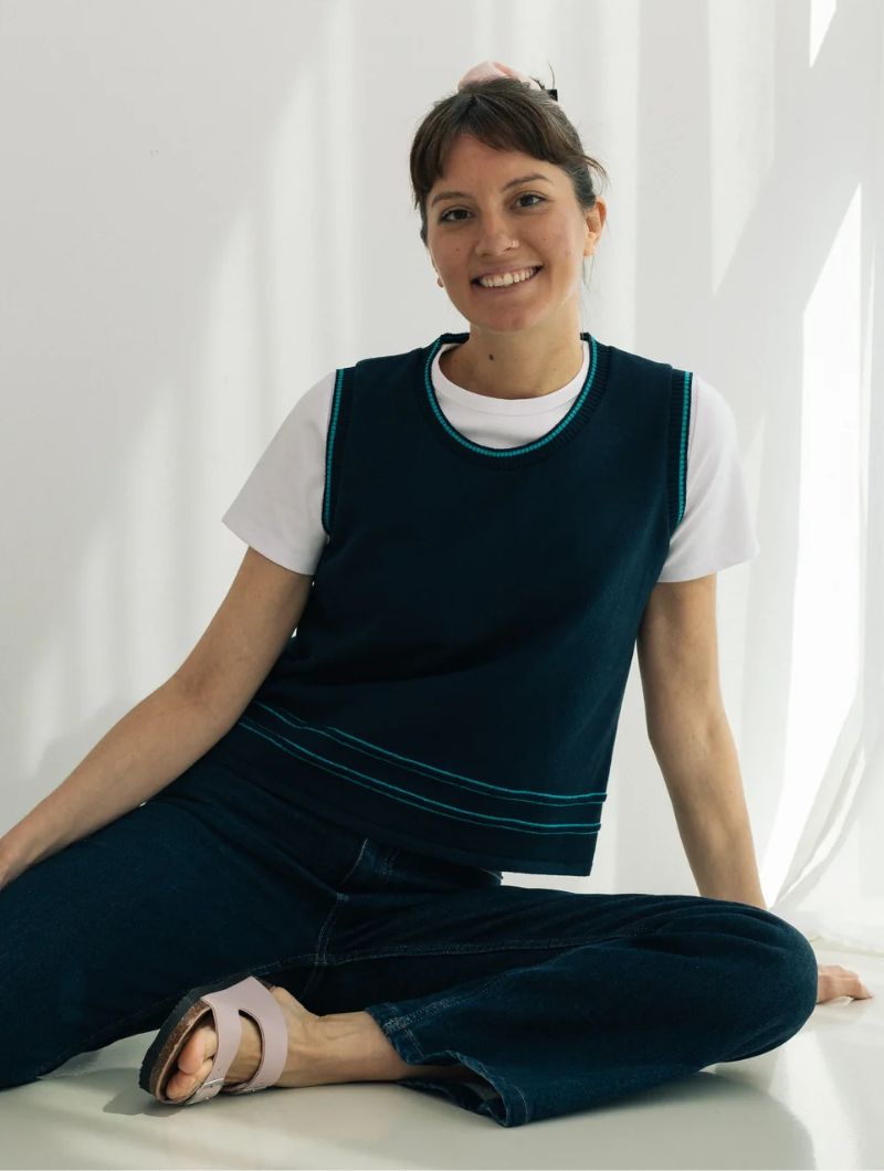 Chaleco de punto sin mangas de diseño liso y líneas limpias, con silueta recta y ajuste relajado que se adapta sin ceñir. El protagonismo recae en los ribetes en contraste que recorren cuello, sisas y bajo, aportando definición y un detalle gráfico sutil.