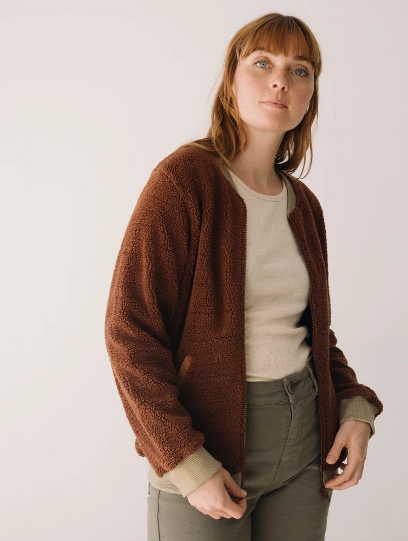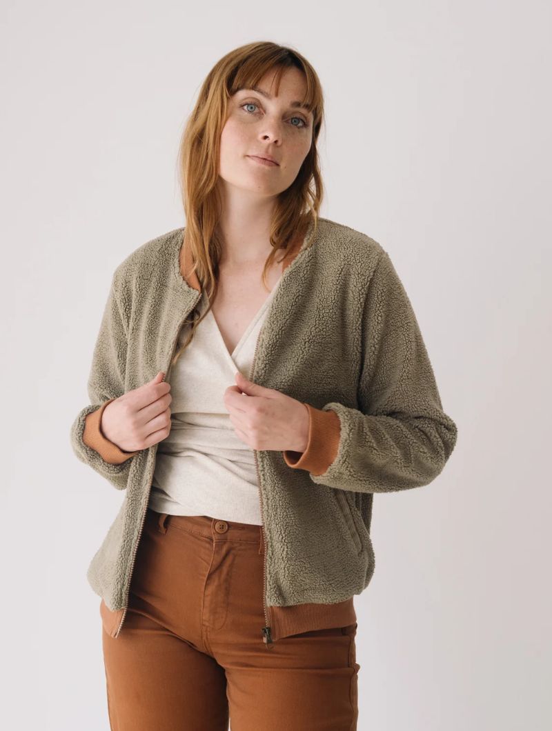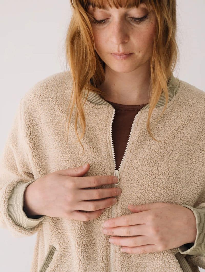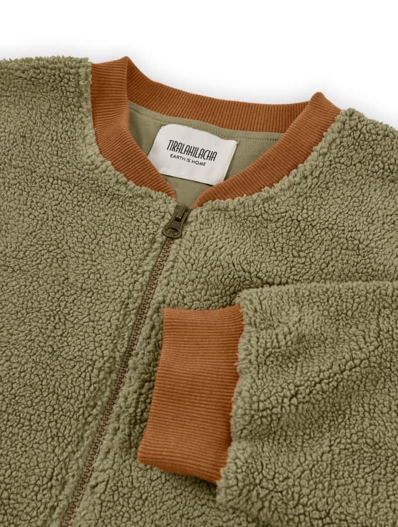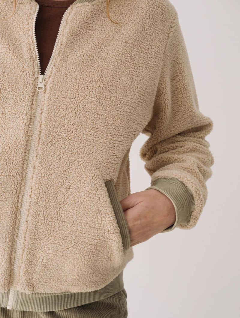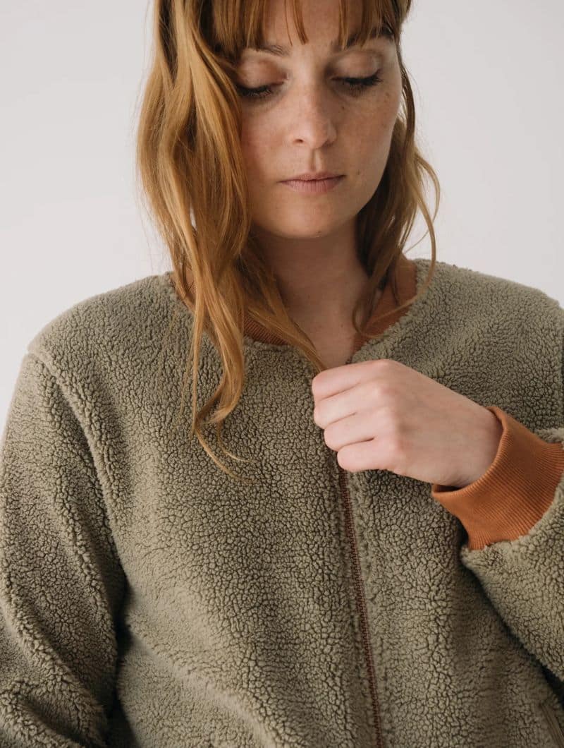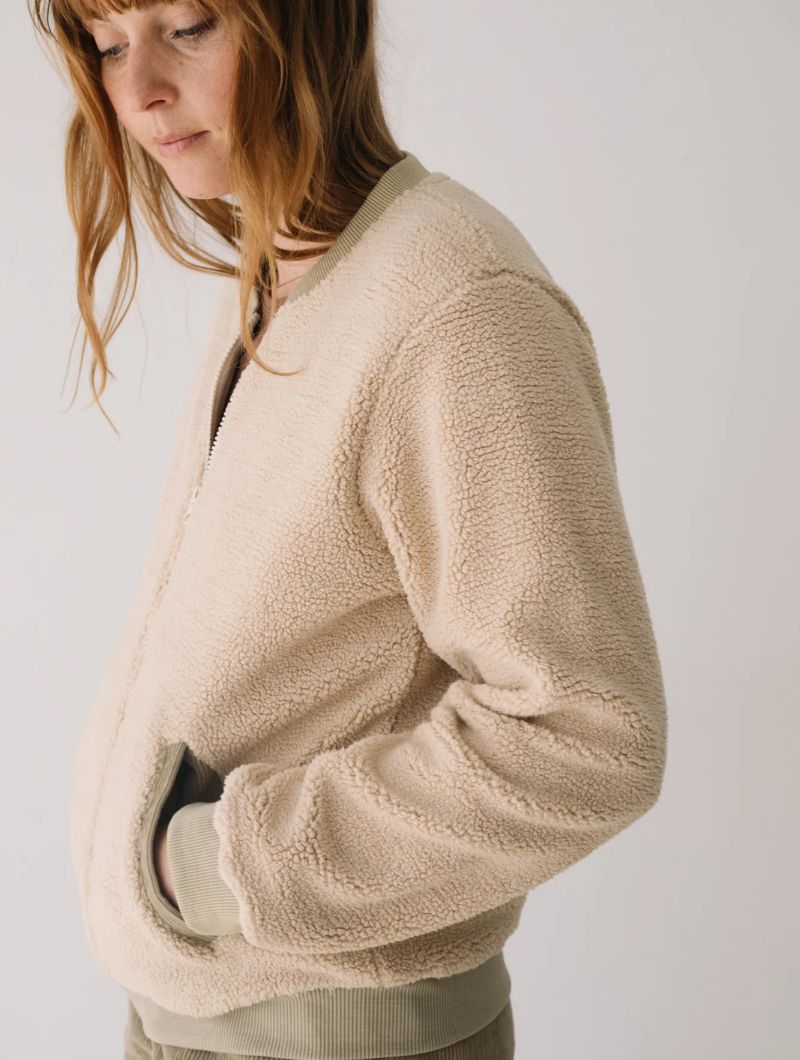 Chaqueta tipo bomber confeccionada en borreguito grueso 100% de algodón orgánico certificado GOTS. Un tejido cálido, suave y mullido que abriga sin añadir peso.