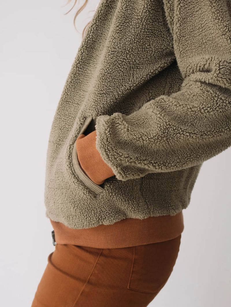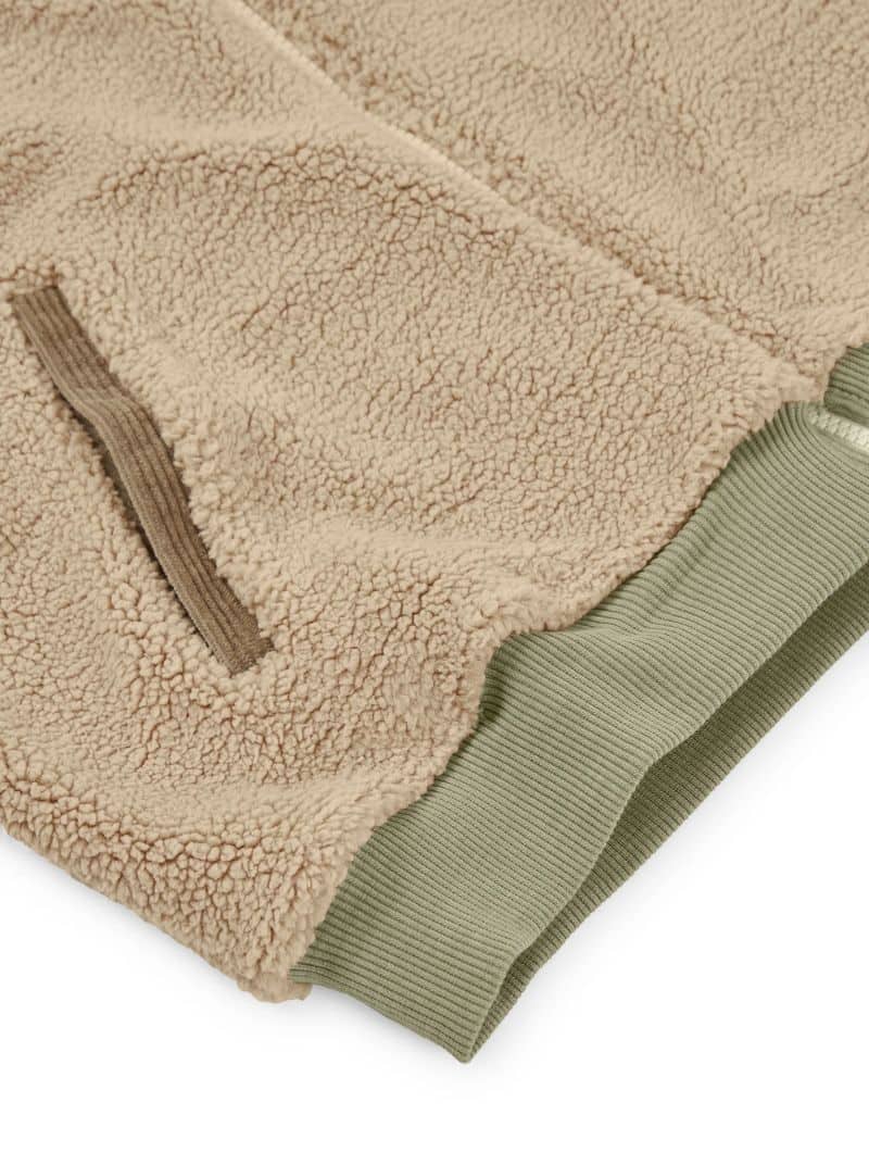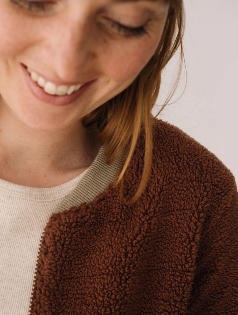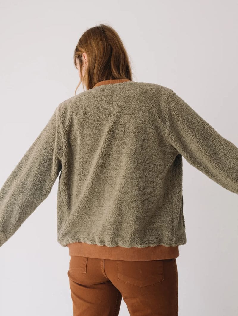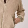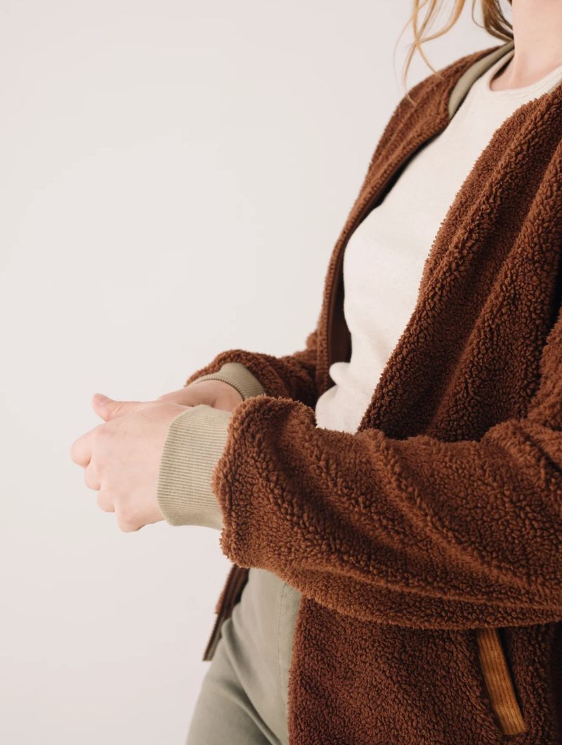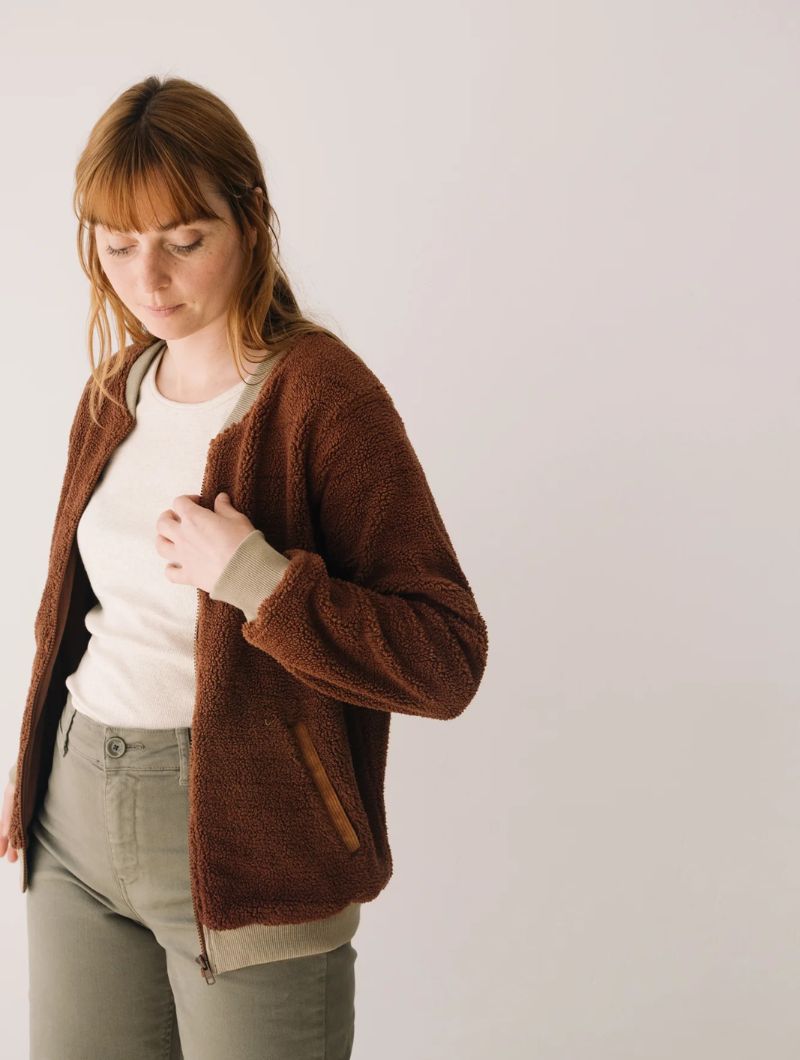 Chaqueta tipo bomber confeccionada en borreguito grueso 100% de algodón orgánico certificado GOTS. Un tejido cálido, suave y mullido que abriga sin añadir peso.
