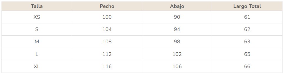 Las medidas están especificadas en centímetros. La producción se realiza de forma manual, por lo que puede haber pequeñas variaciones. Compara estas dimensiones con tu contorno de pecho, tu cadera y con tu altura.