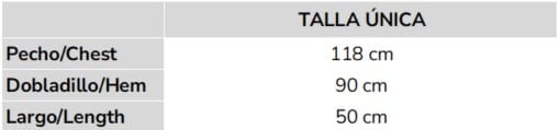 * Las medidas de pecho y dobladillo se refieren a los contornos. Son medidas aproximadas y puede haber pequeñas variaciones.