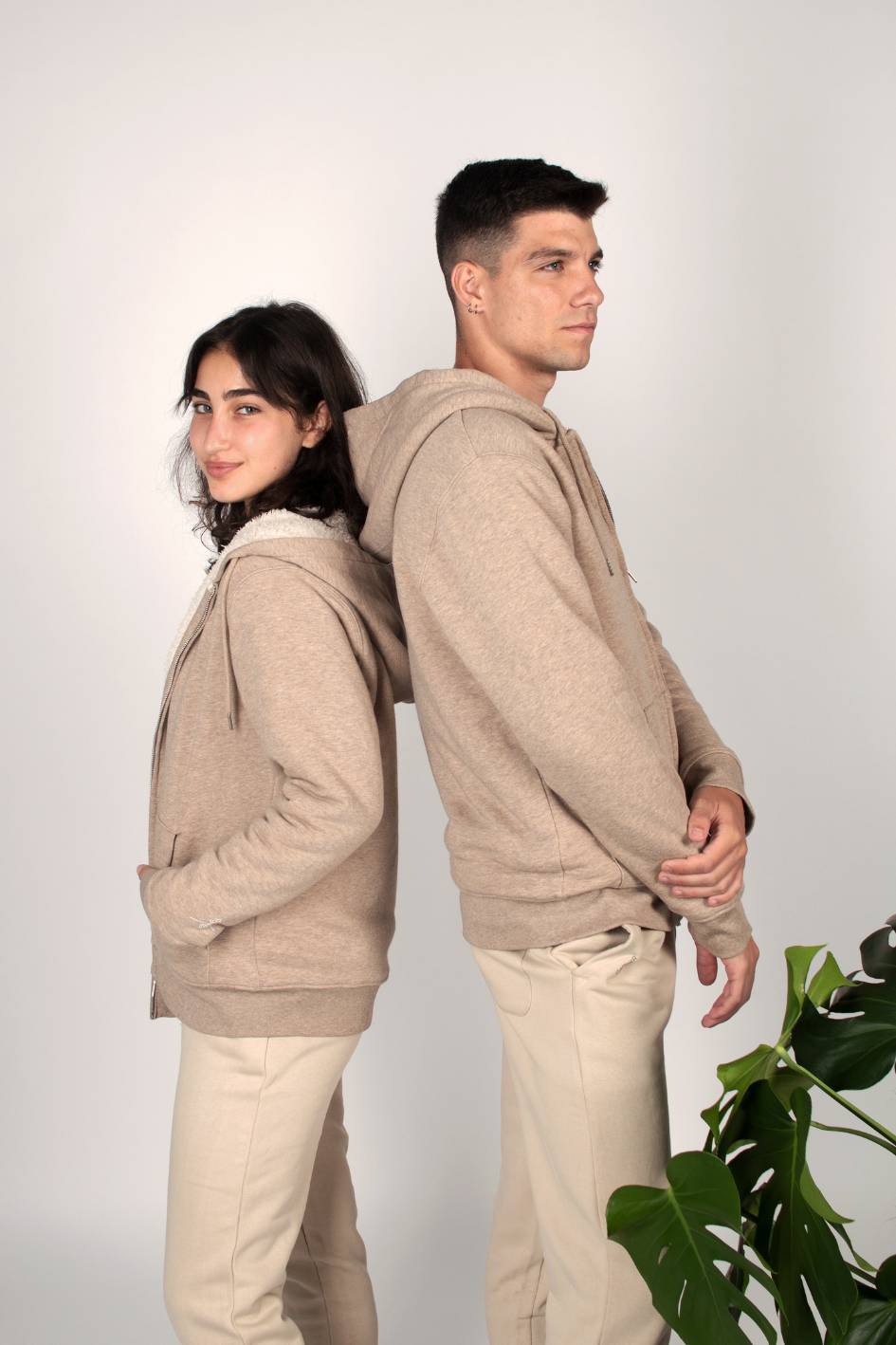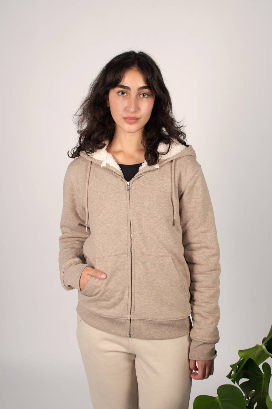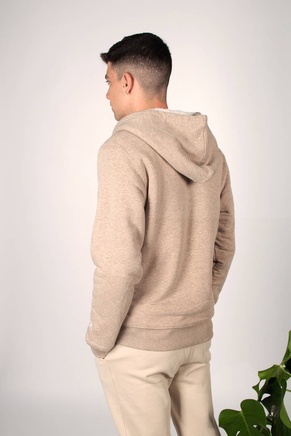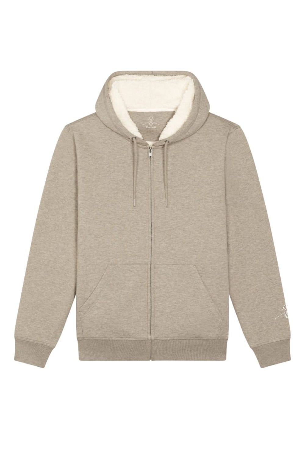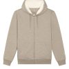 Chaqueta unisex con capucha, corte regular y forro interior de borreguillo 100% reciclado. El tejido exterior jaspeado combina 85% algodón orgánico con 15% poliéster reciclado, logrando una prenda cálida, cómoda y resistente al uso diario en invierno.