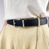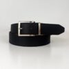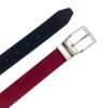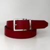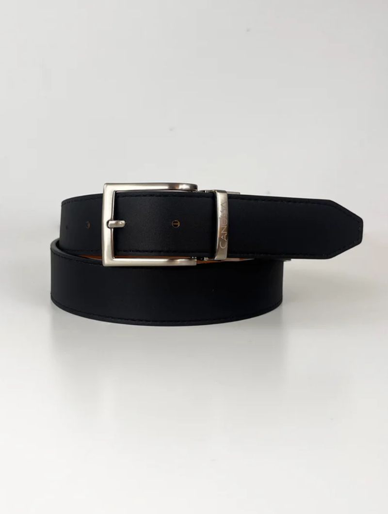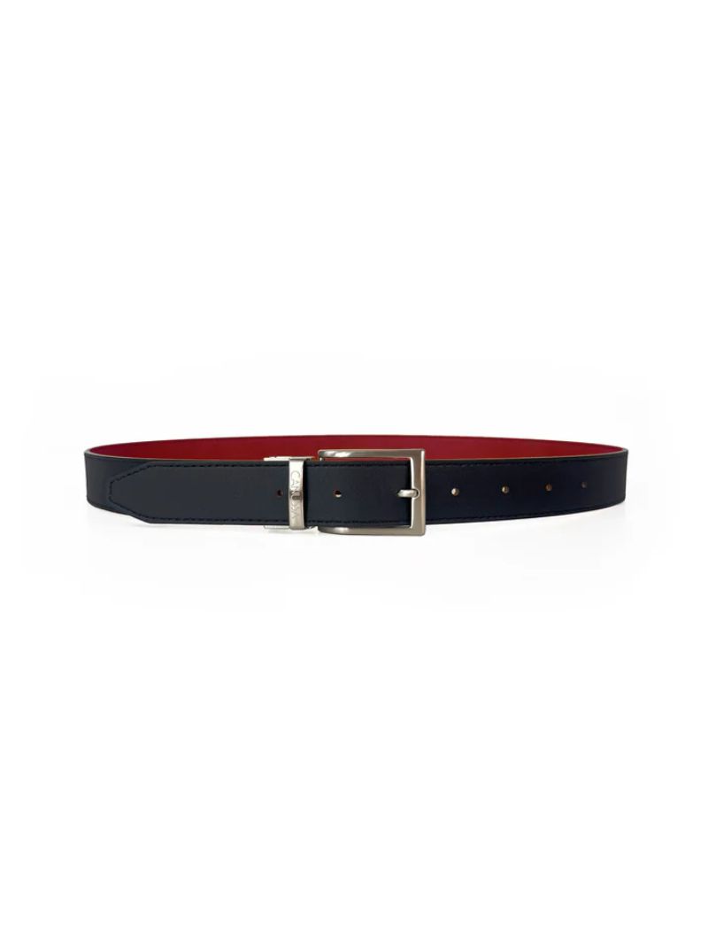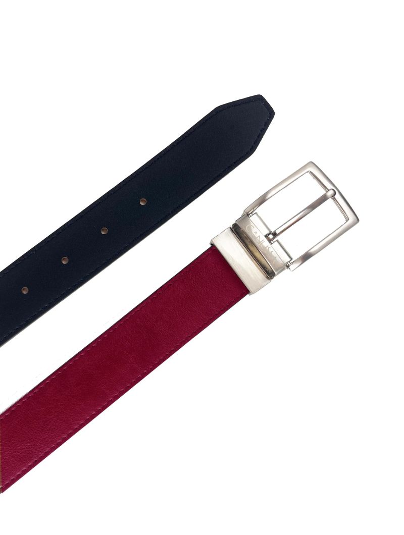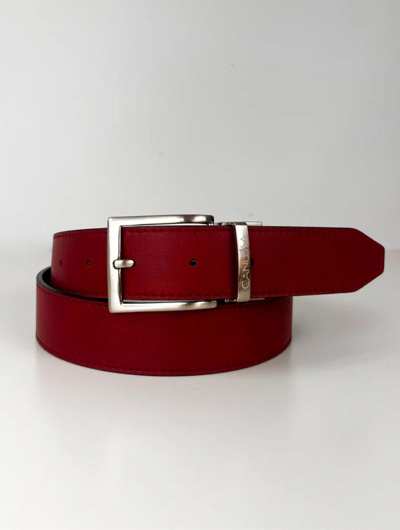 Cinturón reversible confeccionado en microfibra ecológica certificada Oeko-Tex® Standard 100, una alternativa vegana al cuero natural. Su hebilla giratoria permite usarlo por el lado negro o por el rojo, combinando con distintos estilos y ocasiones.