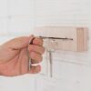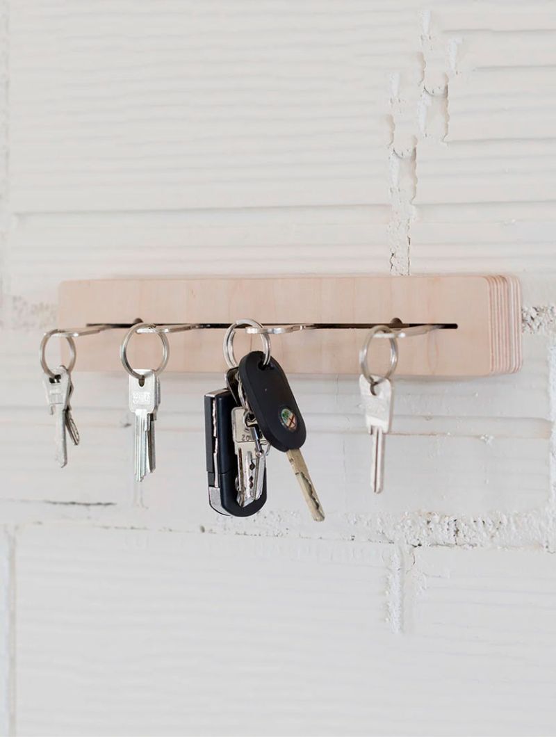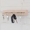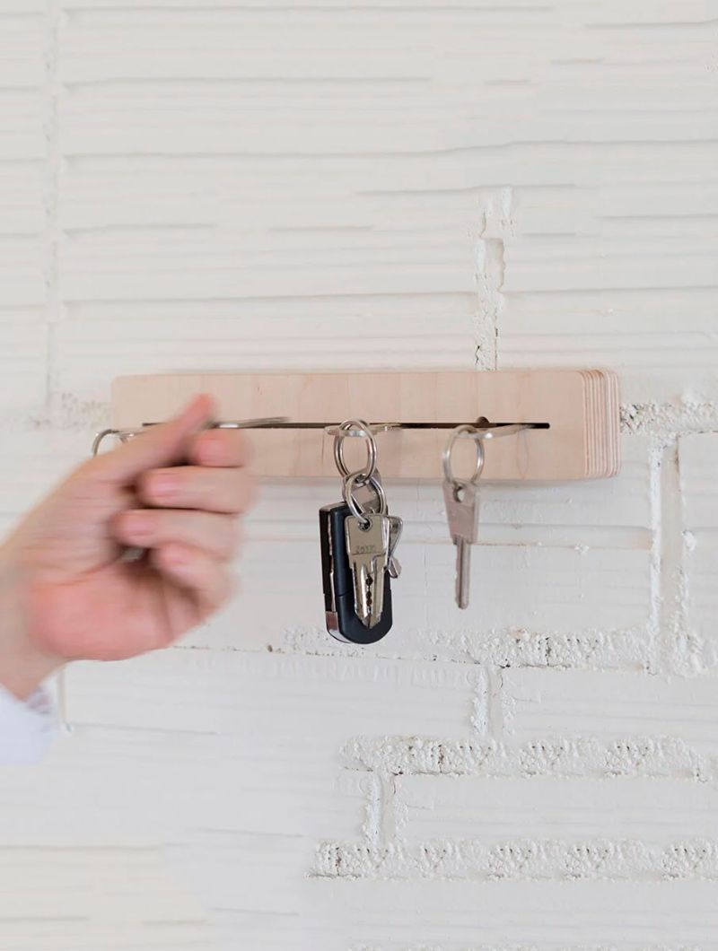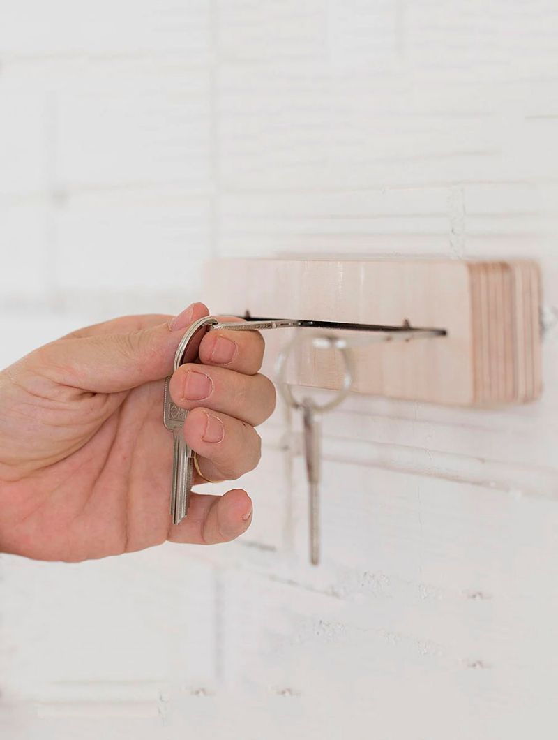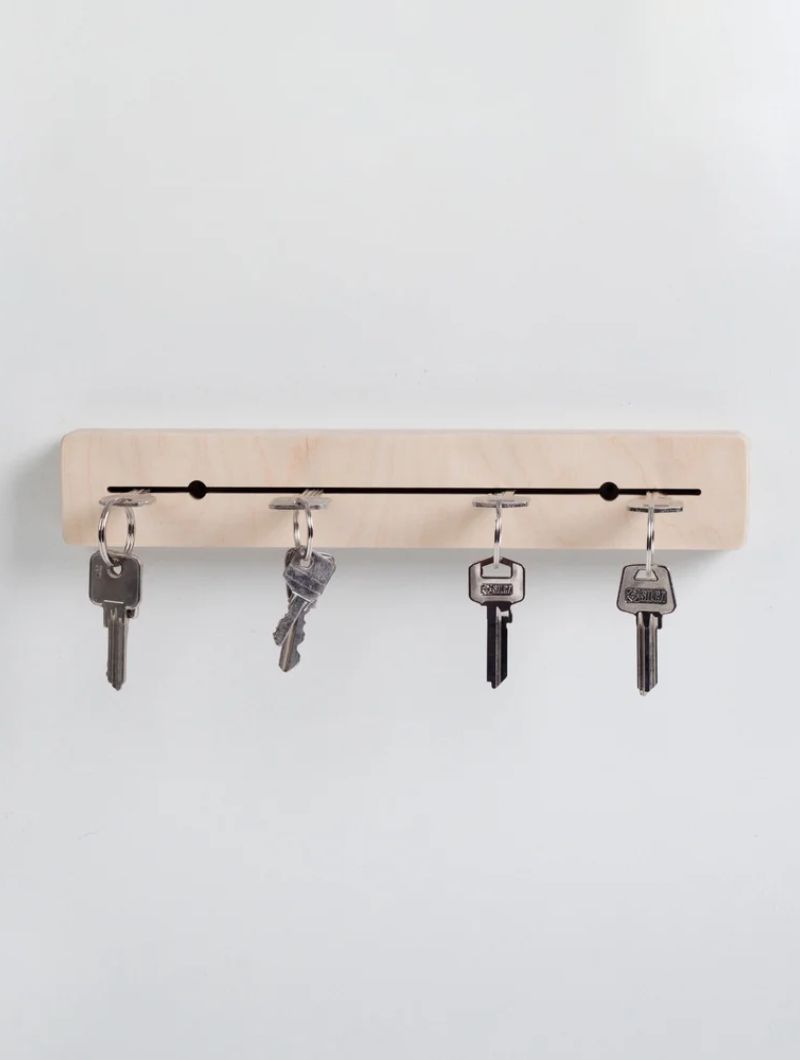 Colgador de madera diseñado para mantener las llaves en su sitio y localizarlas fácilmente al salir de casa. Su ranura central sujeta la llave que se introduce en el soporte y aprovecha su propio peso para sostener el llavero completo con firmeza.