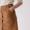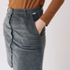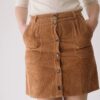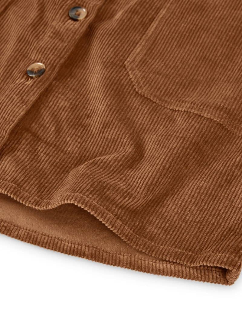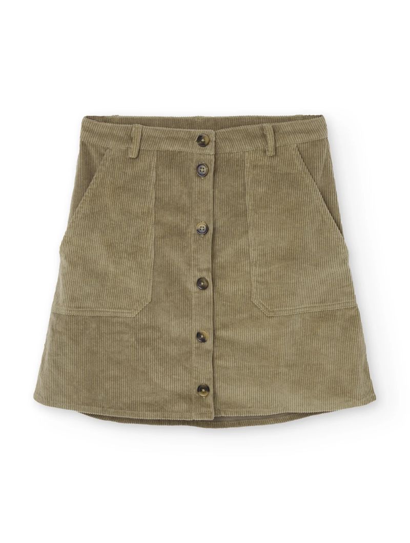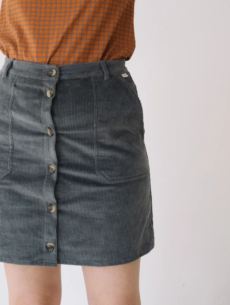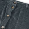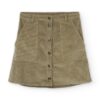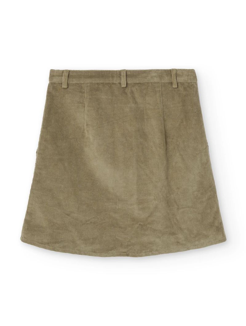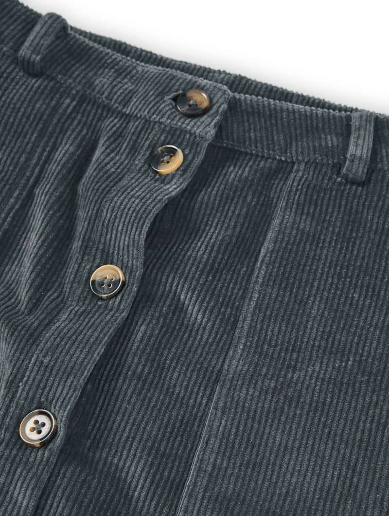 Falda de pana gruesa confeccionada con algodón orgánico certificado GOTS (95%) y un pequeño porcentaje de elastano (5%) para mayor confort. Su tejido es cálido, flexible y suave, ideal para los meses fríos.