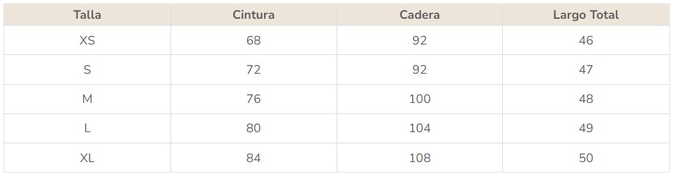 Las medidas están especificadas en centímetros. La producción se realiza de forma manual, por lo que puede haber pequeñas variaciones. Compara estas dimensiones con tu contorno de cintura, cadera y con tu altura.