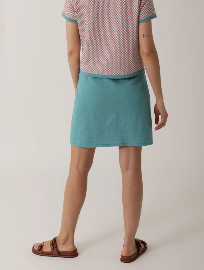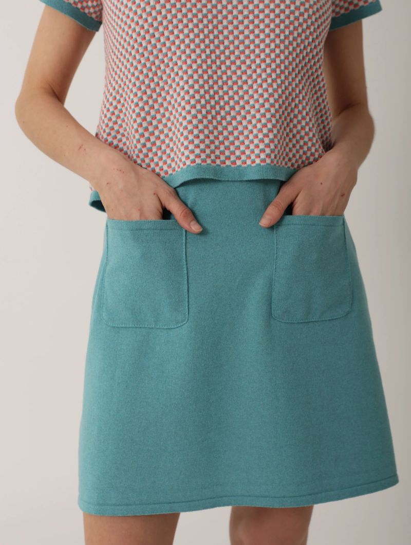Falda lisa de punto con silueta evasé que abre ligeramente desde la cintura, generando una caída fluida y favorecedora. El diseño limpio se combina con dos bolsillos frontales de parche, bien integrados, que aportan funcionalidad sin romper la línea de la prenda.
