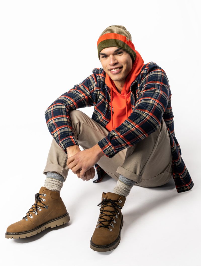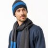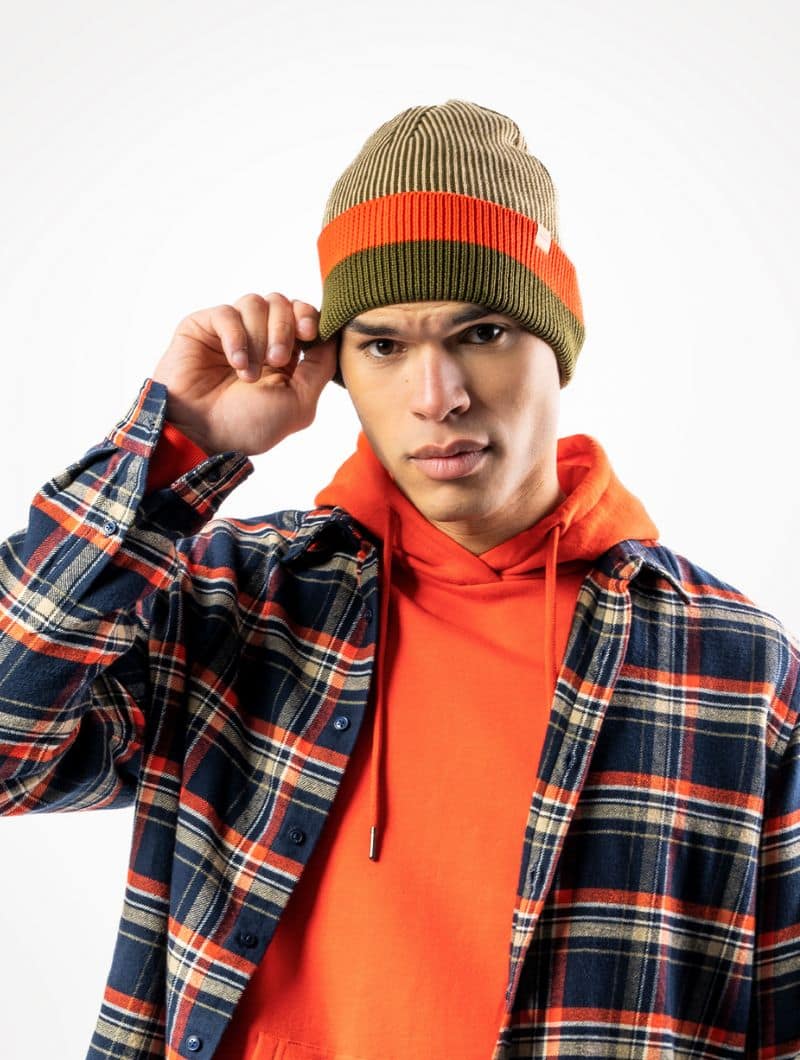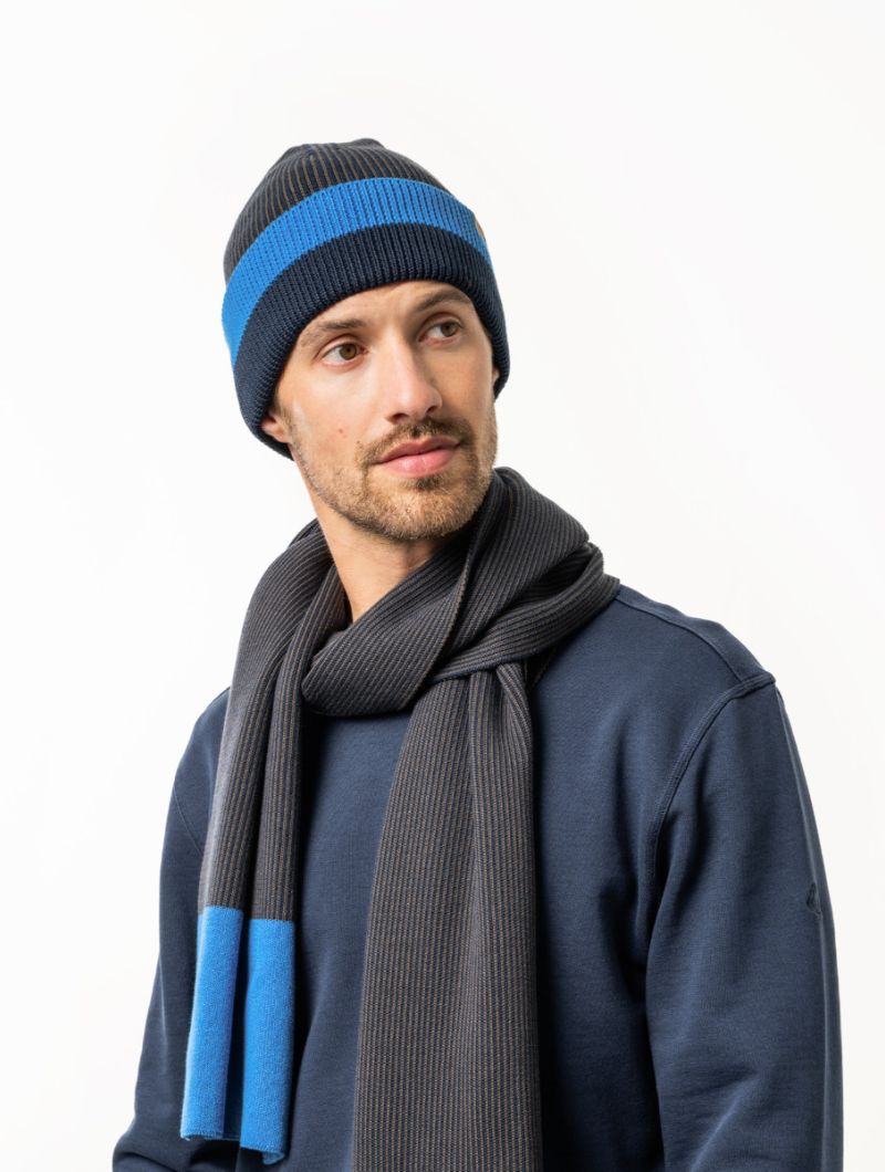 Disponible en azul oscuro con bloque azul claro o verde musgo con bloque naranja. A juego con la bufanda del mismo diseño.