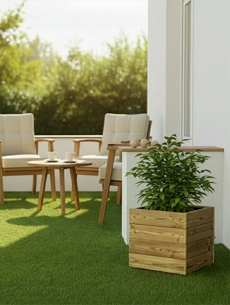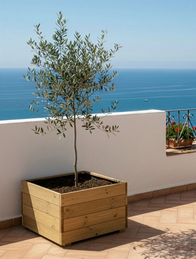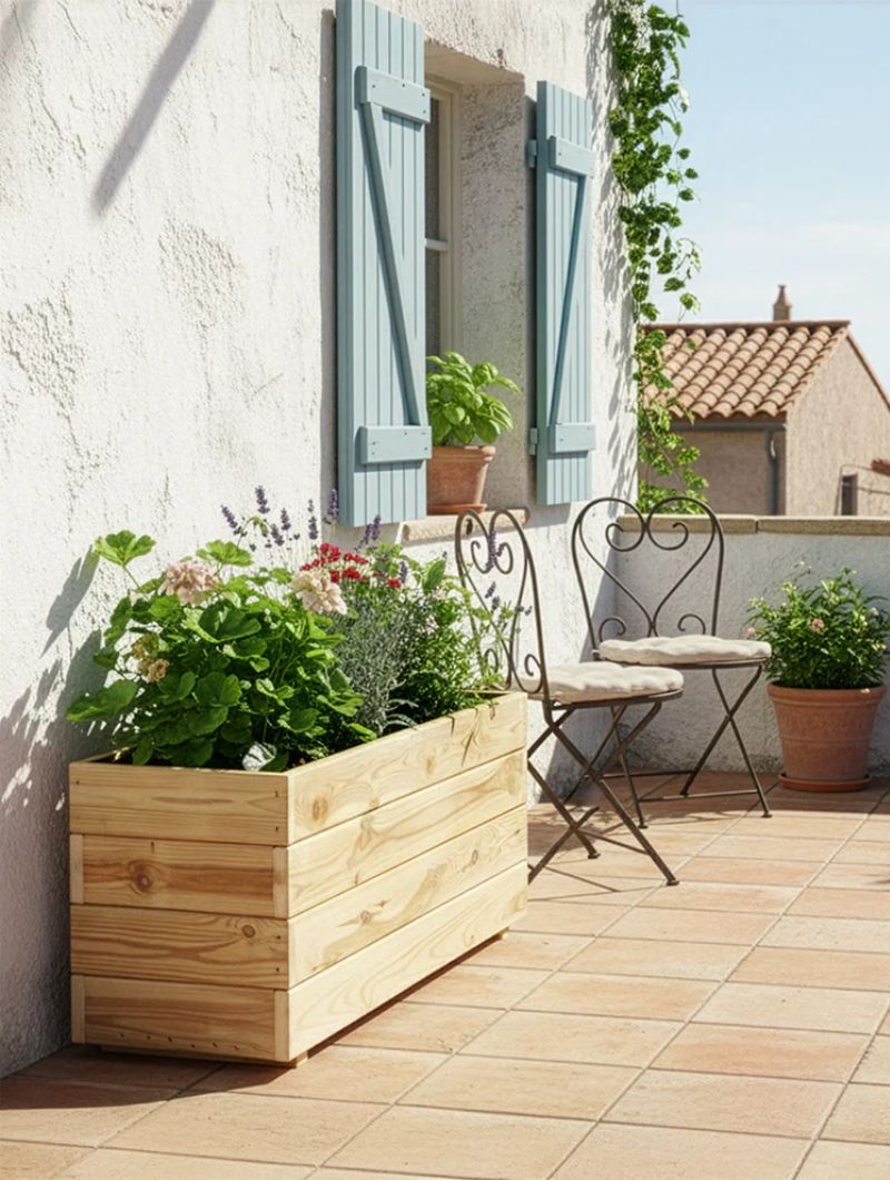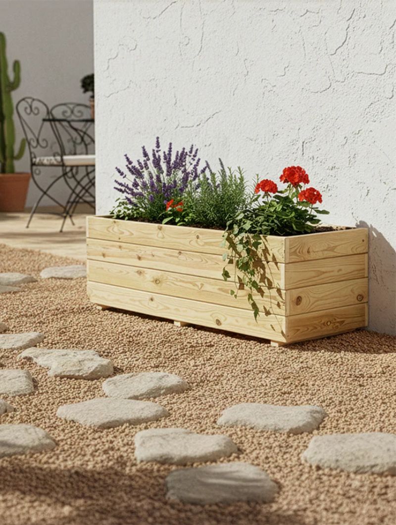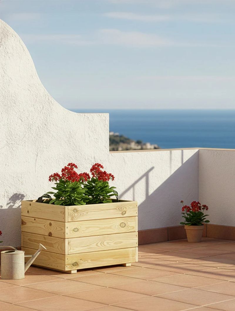 Jardineras de madera fabricadas con listones de pino nórdico, un material noble que permite crear una atmósfera elegante y natural.