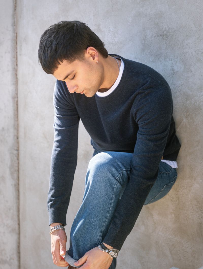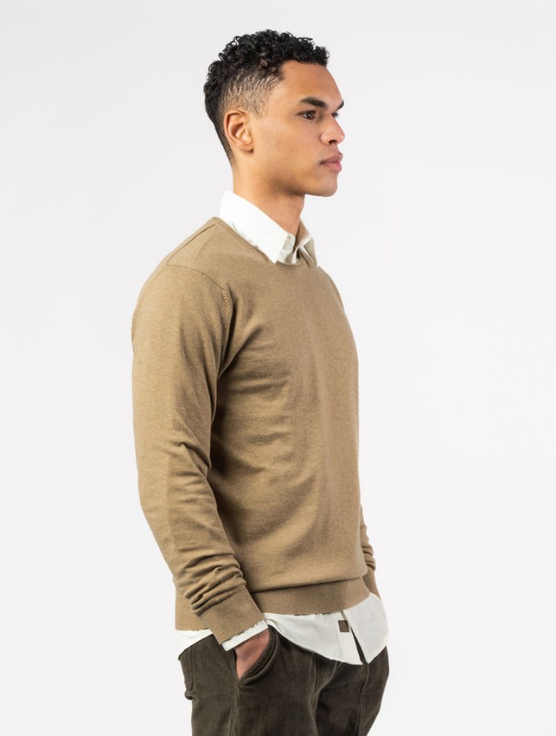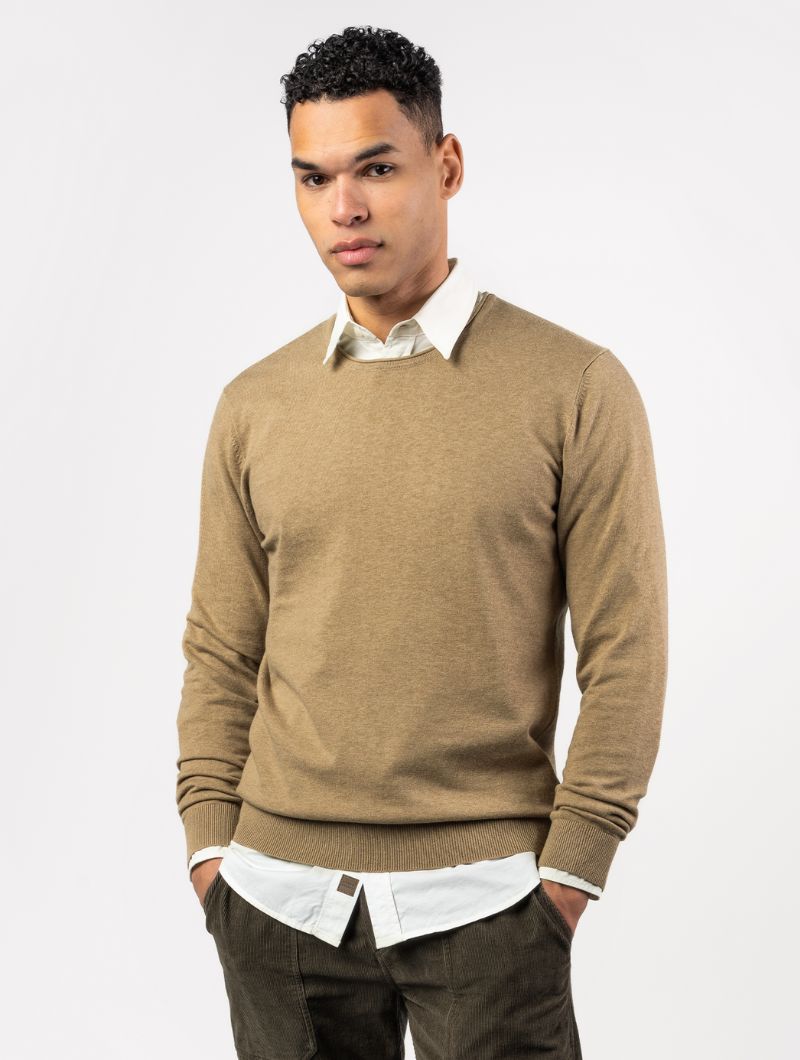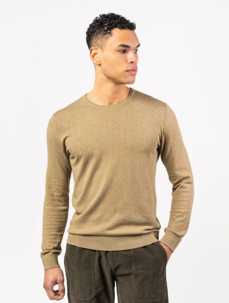 Jersey de hombre con cuello redondo en mezcla de algodón orgánico y lana. Una prenda suave, cálida y ligera, pensada para acompañarte en el día a día.