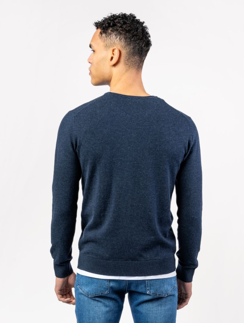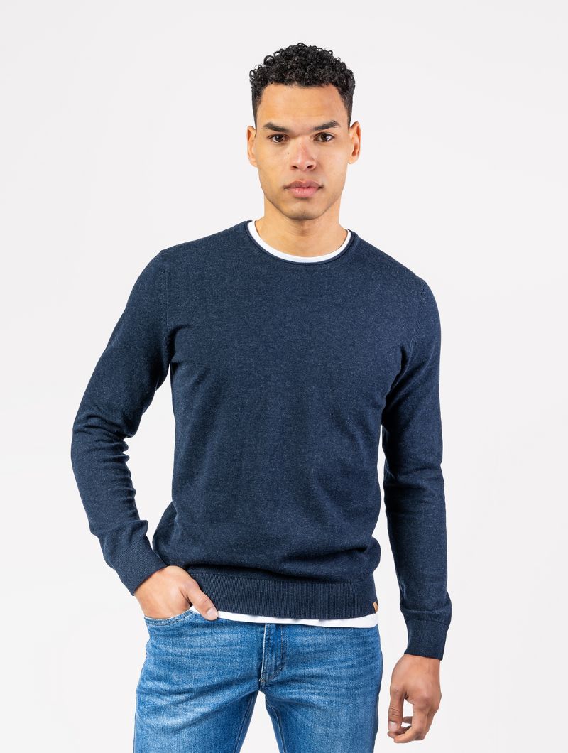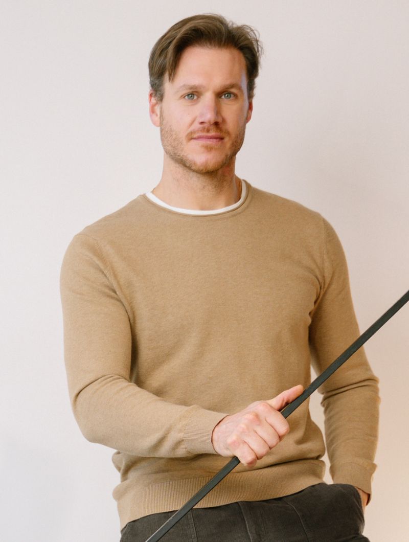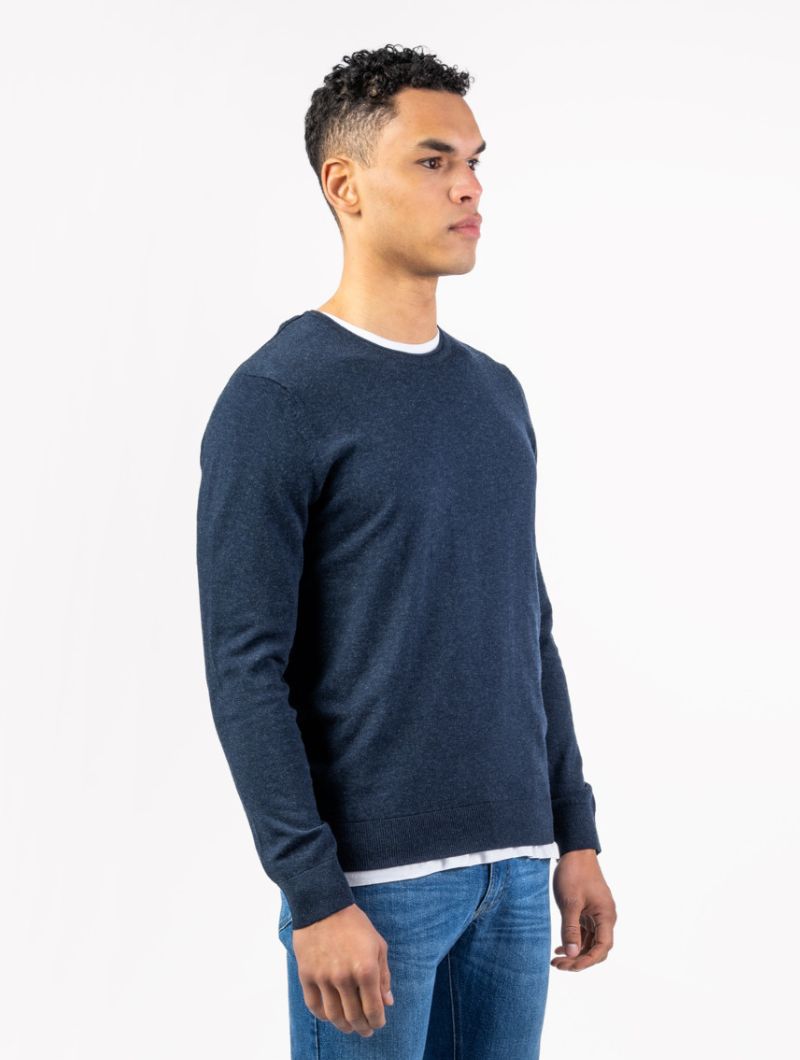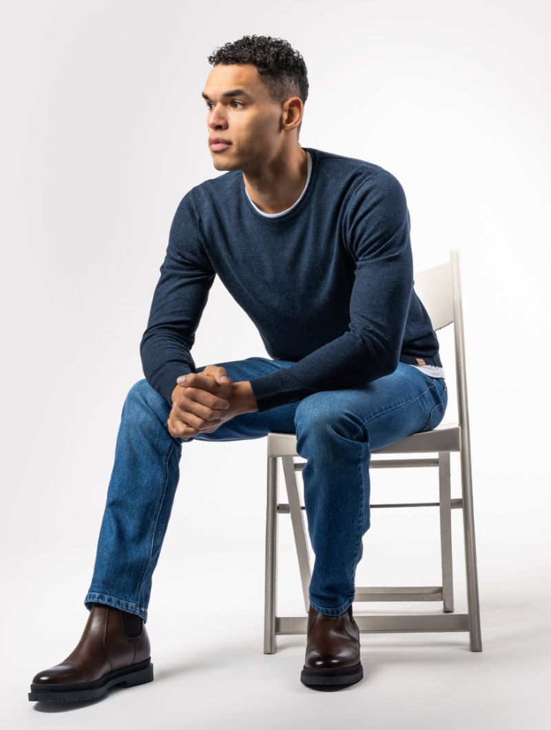 Jersey de hombre con cuello redondo en mezcla de algodón orgánico y lana. Una prenda suave, cálida y ligera, pensada para acompañarte en el día a día.