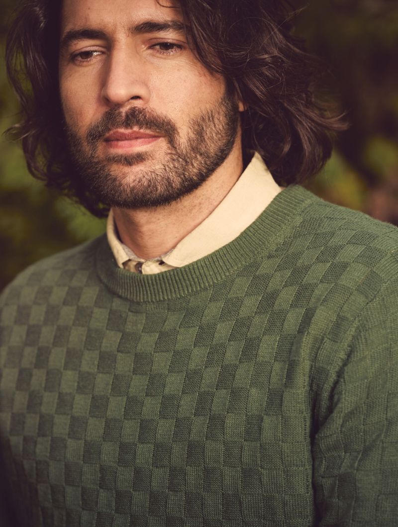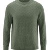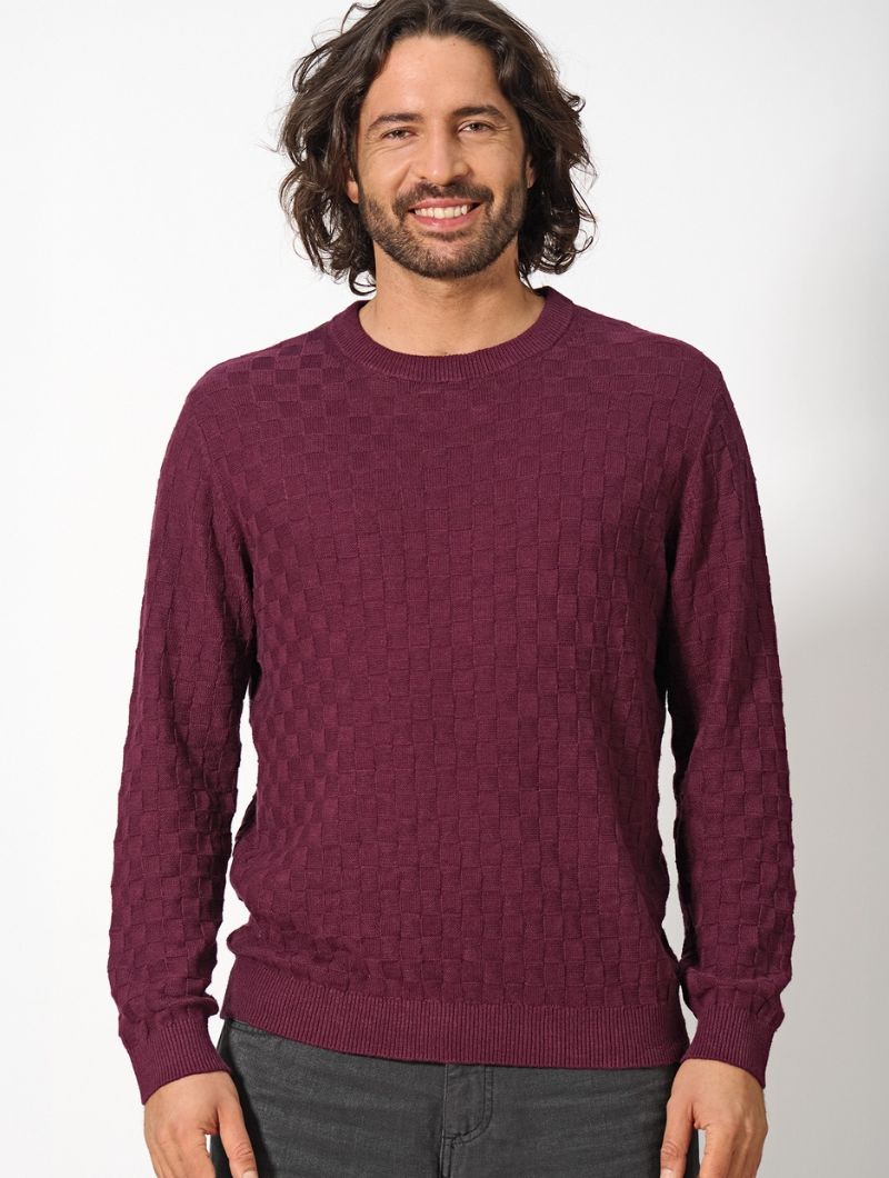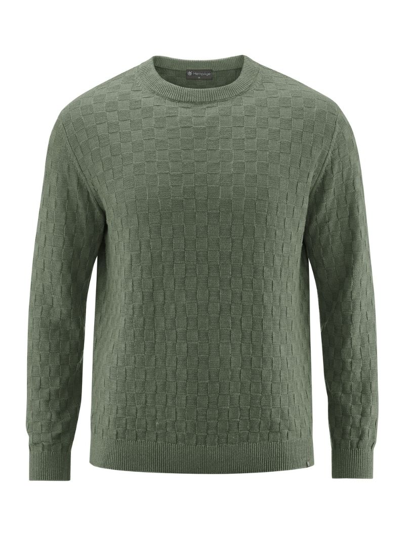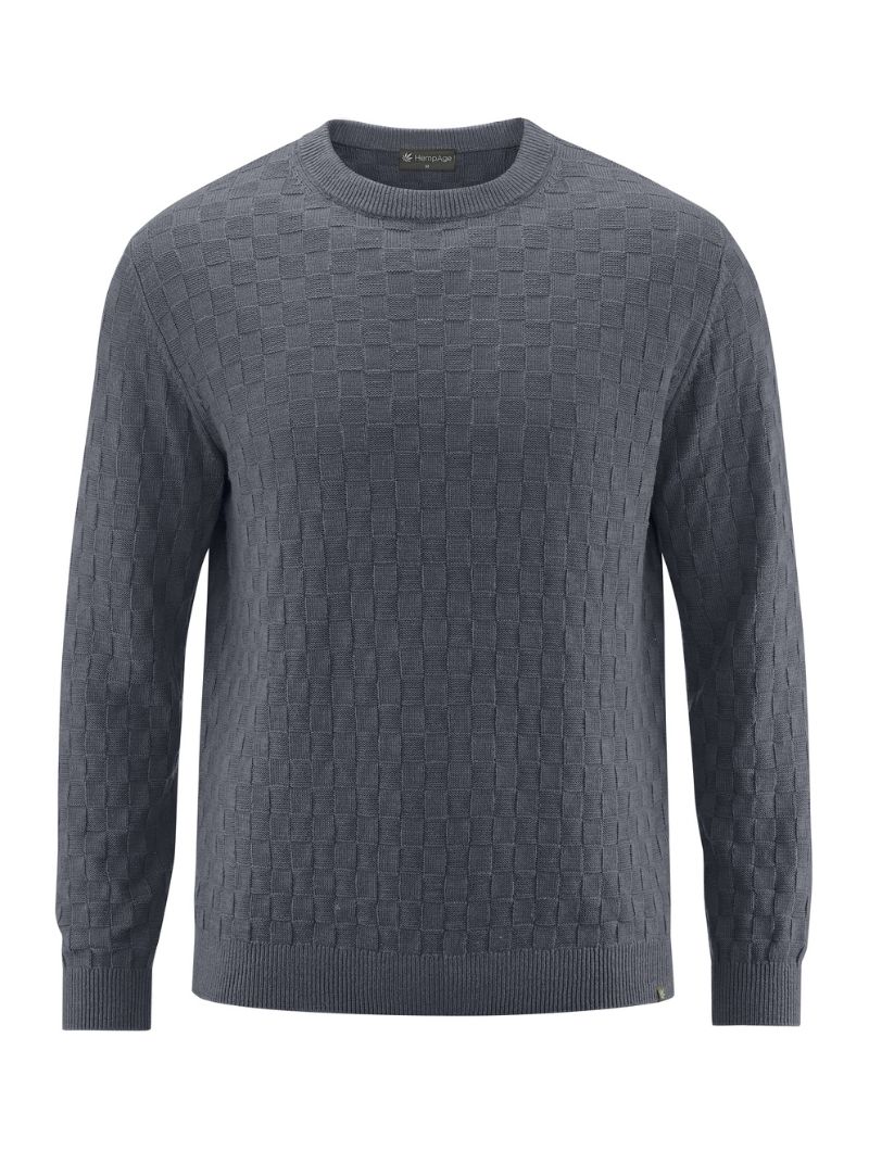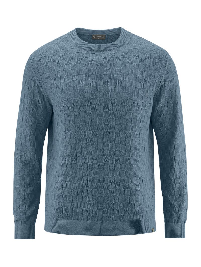 Jersey de corte relajado tejido en 55% cáñamo y 45% algodón orgánico. Su estructura de punto brioche crea un efecto de cuadrícula con relieve sutil, que aporta textura sin perder sobriedad. Los remates acanalados en cuello, mangas y bajo le dan un acabado limpio y resistente.