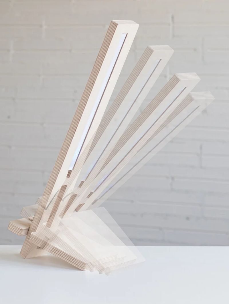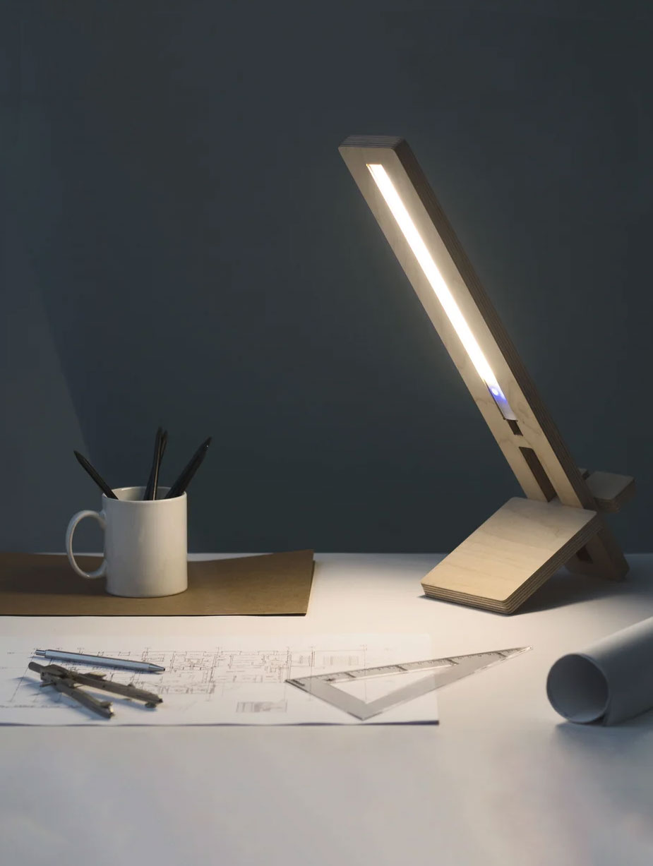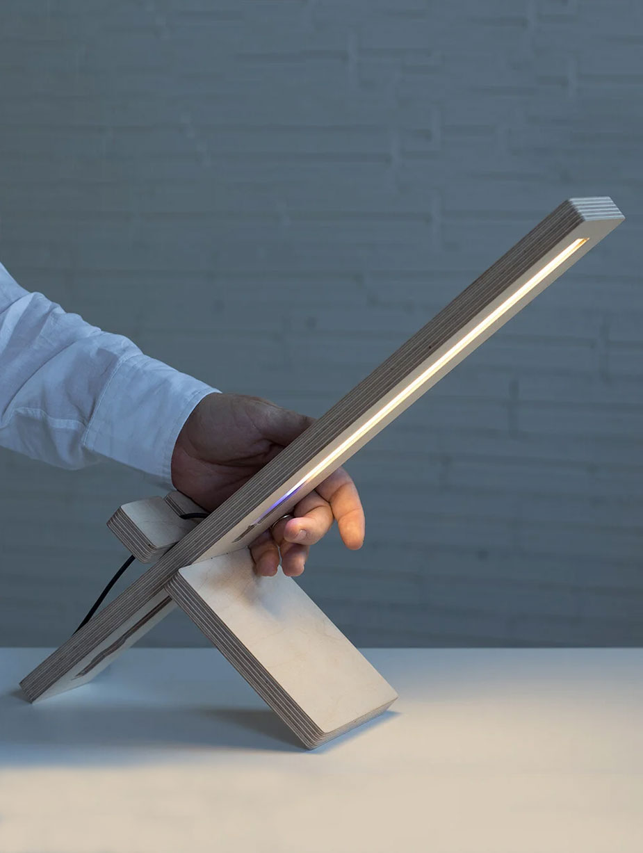 Lámpara de mesa de diseño sencillo y cálido, fabricada íntegramente en madera de abedul. Su estructura desmontable está formada por dos piezas encajables y un brazo que puede inclinarse para ajustar la dirección de la luz.