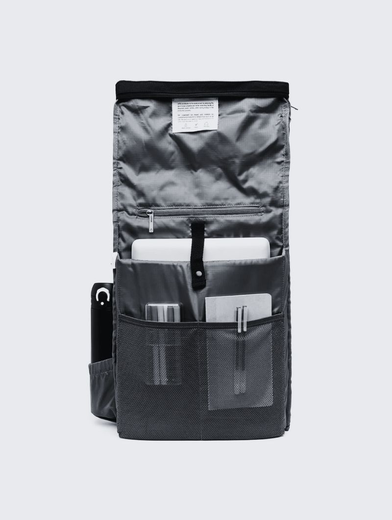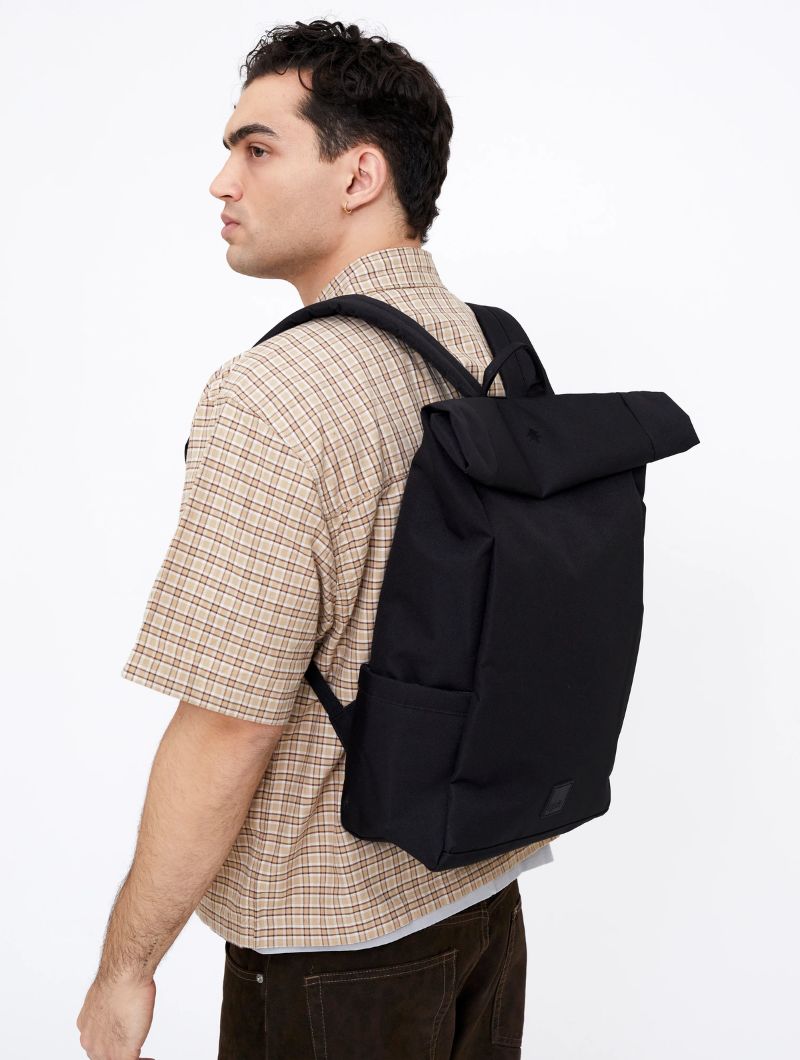 Esta mochila enrollable de dos posiciones combina diseño funcional y sostenibilidad. El sistema de cierre superior con cremallera y potentes imanes permite ajustarla según la carga, ofreciendo máxima seguridad en cualquier situación.