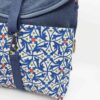 Color: Azul denim con bolsillo estampado modernista. Forro liso de color coral. Tira y asas de color azul denim.